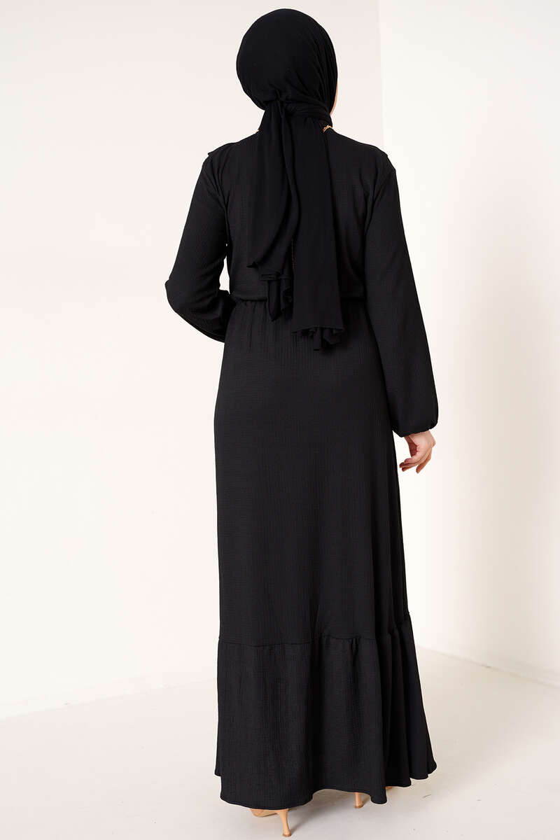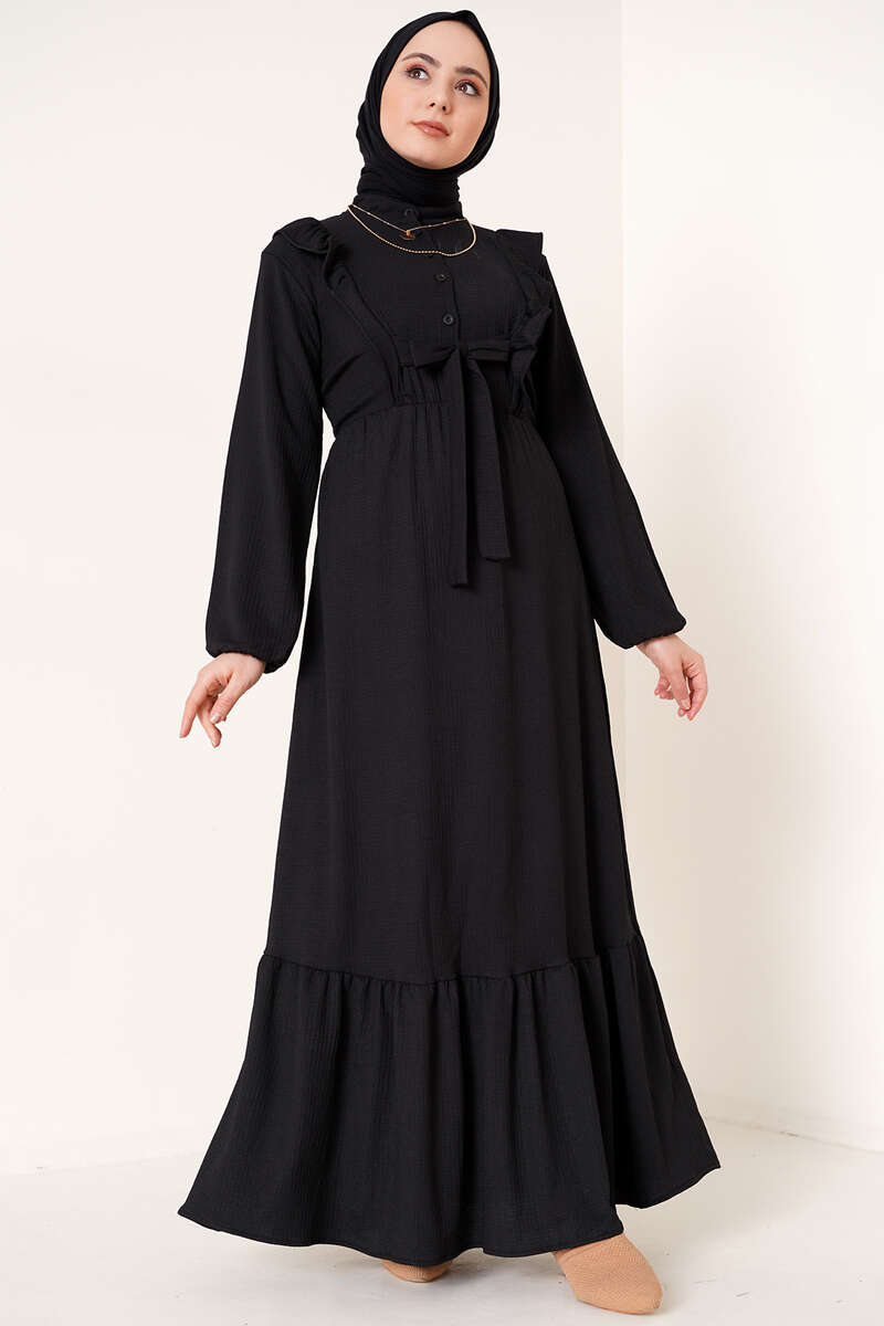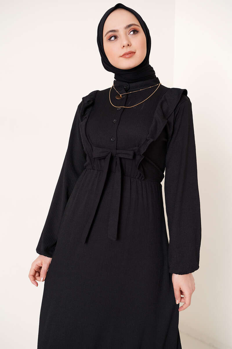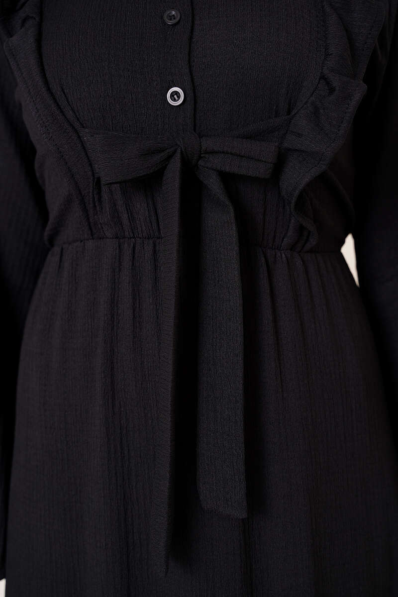 Yeni sezon elbise önü kendinden kuşaklıdır. Göğsünde fırfır detayı bulunan elbisemizin beli ve bilek kısımları lastiklidir. Hakim yaka olan elbisemiz düğmelidir. Tek parçada şık olmanın anahtarı elbisemizin renk çeşitleri vardır.