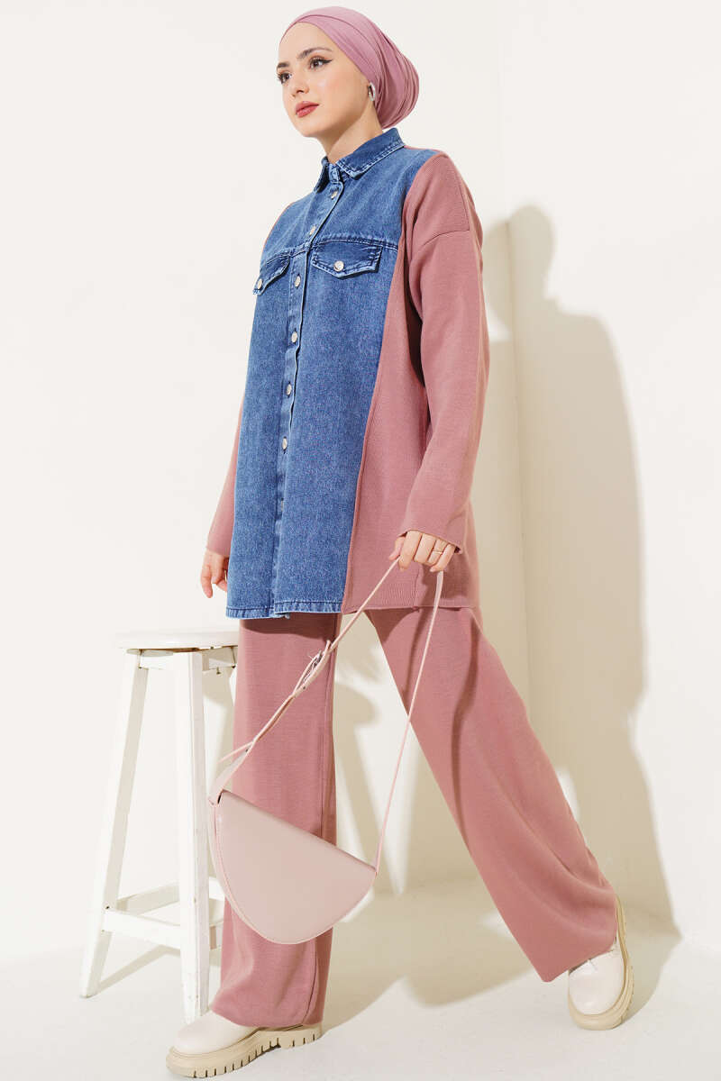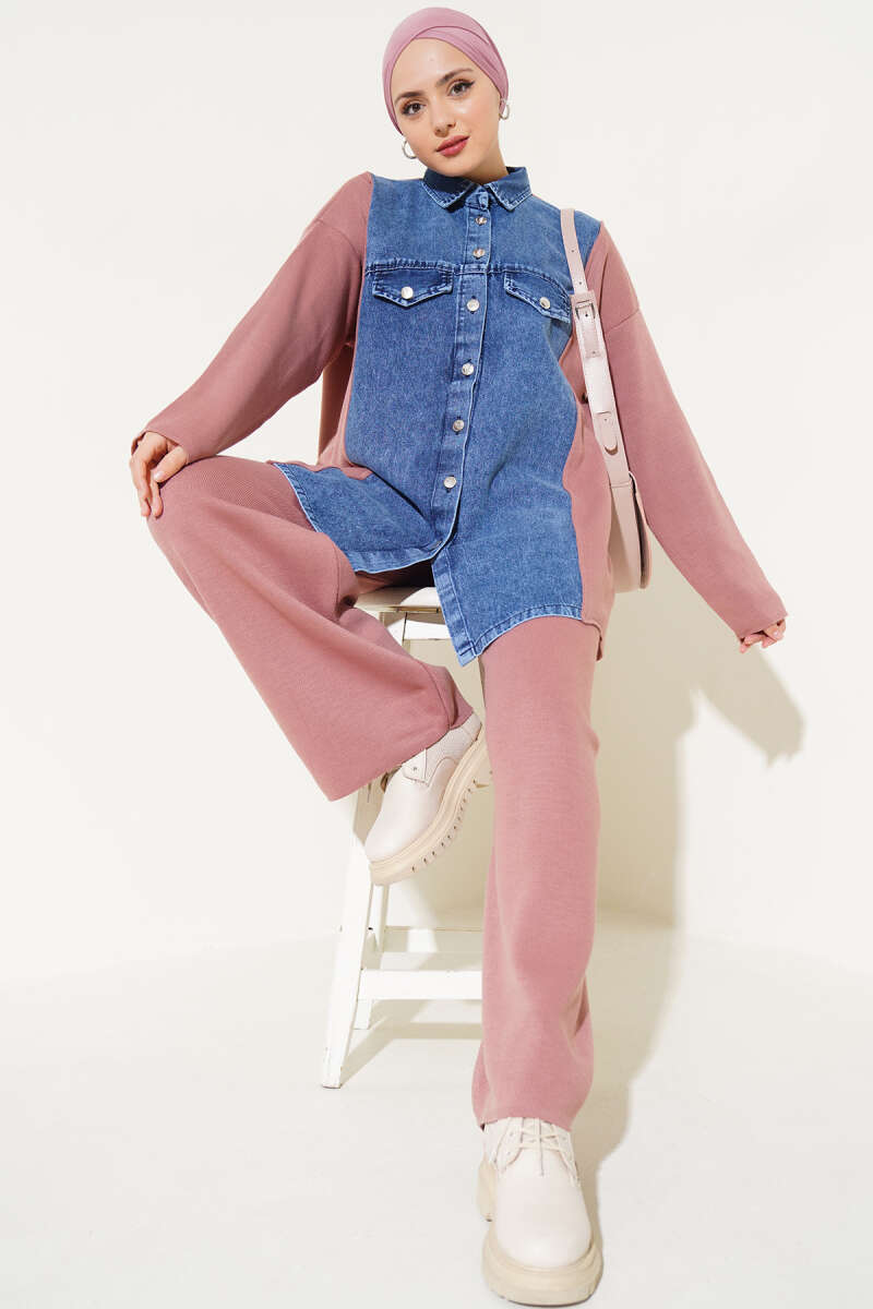 Kuşaklı Metal Düğmeli Kot İkili Takım Kot