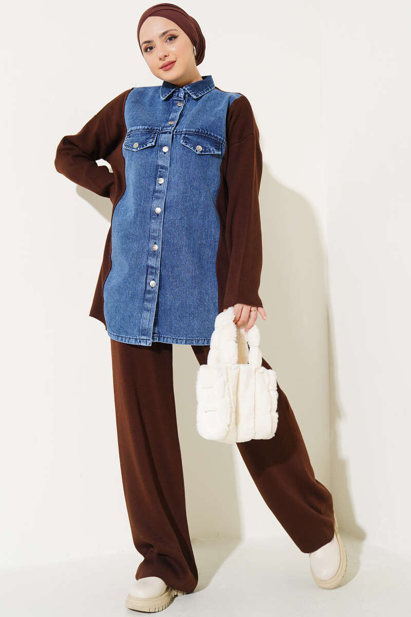 Yaka Kürklü Fermuarlı Triko İkili Takım Taba