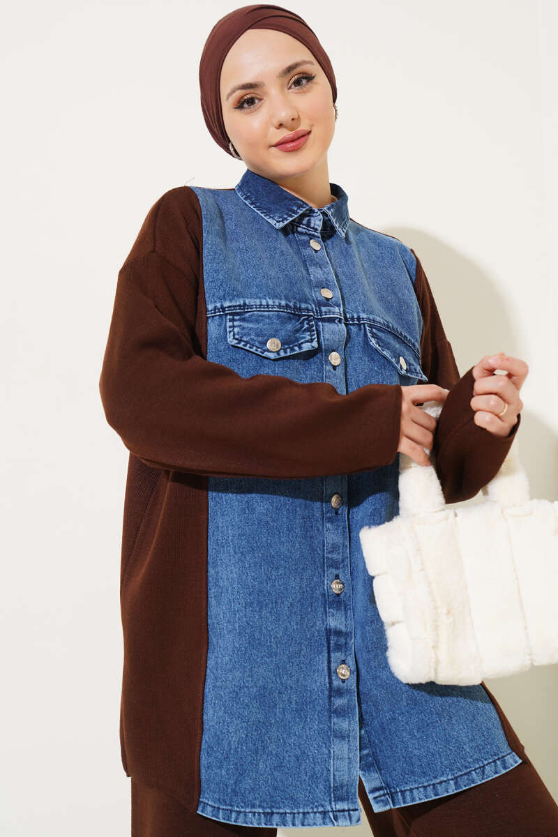 Desenli Yarım Balıkçı Bluz Taba