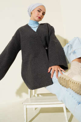 Düğme Detaylı V Yaka Triko Hırka Gri