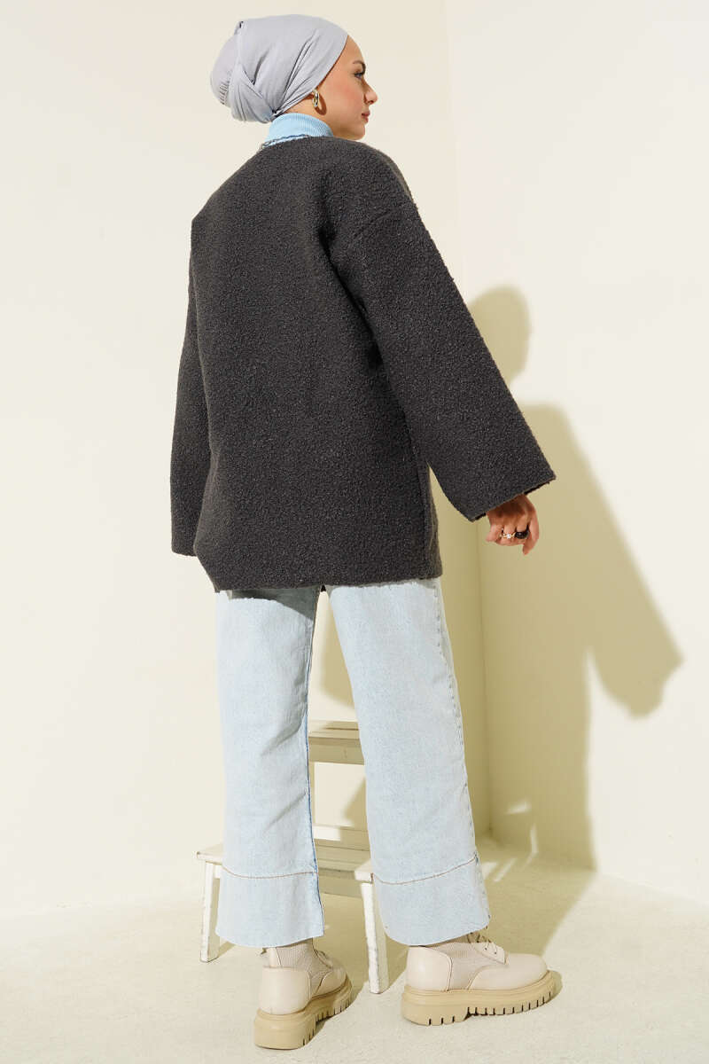 Düğme Detaylı V Yaka Triko Hırka Gri