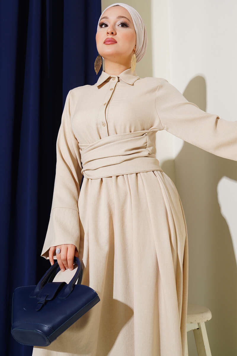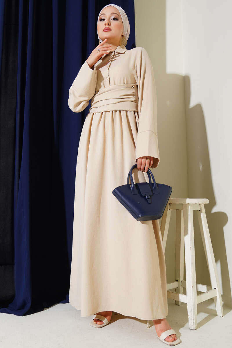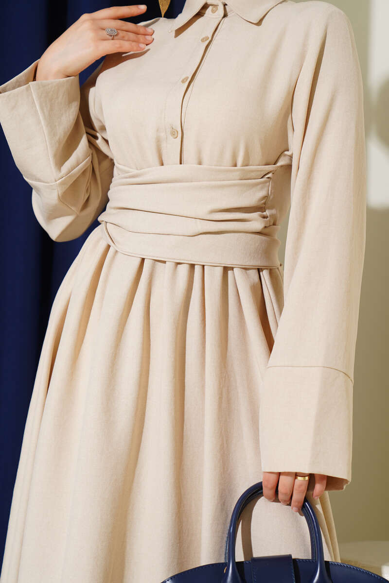 Çift İp Kuşaklı Ekoseli Elbise Bej