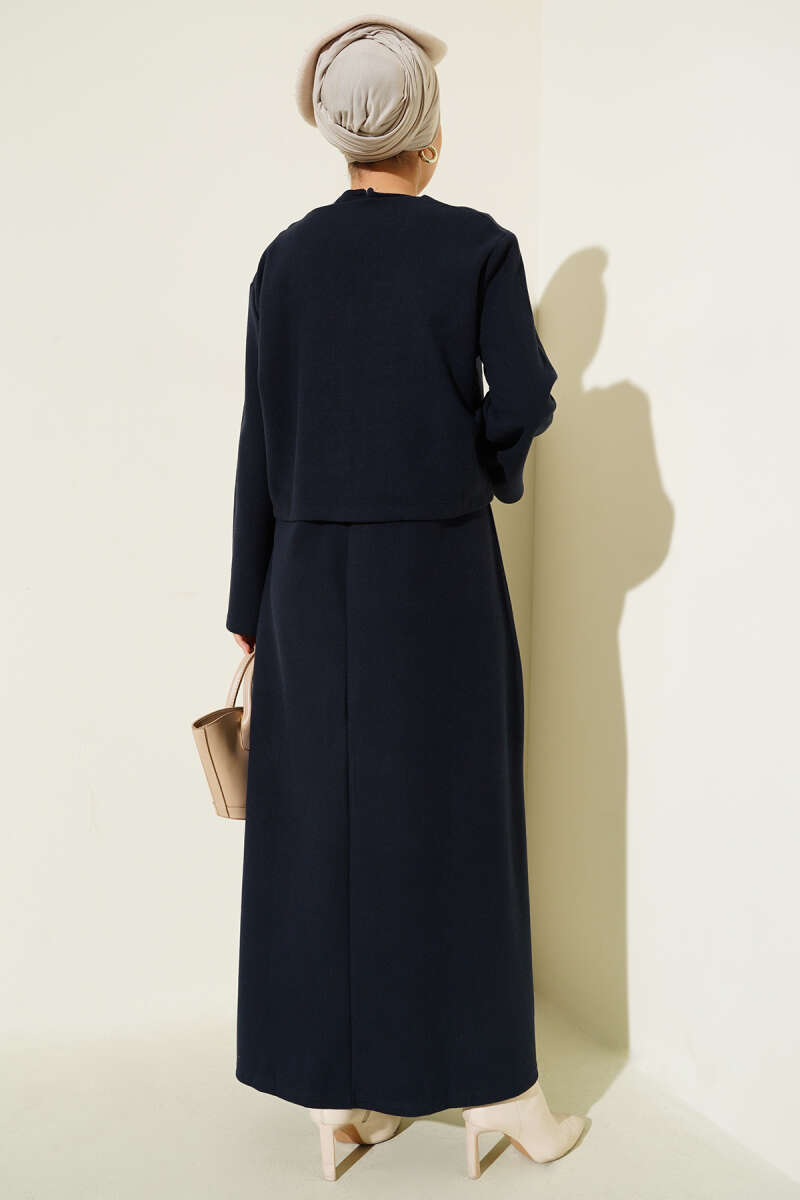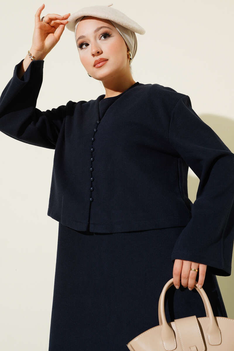 Önü Mini Düğmeli Elbise İkili Takım Lacivert