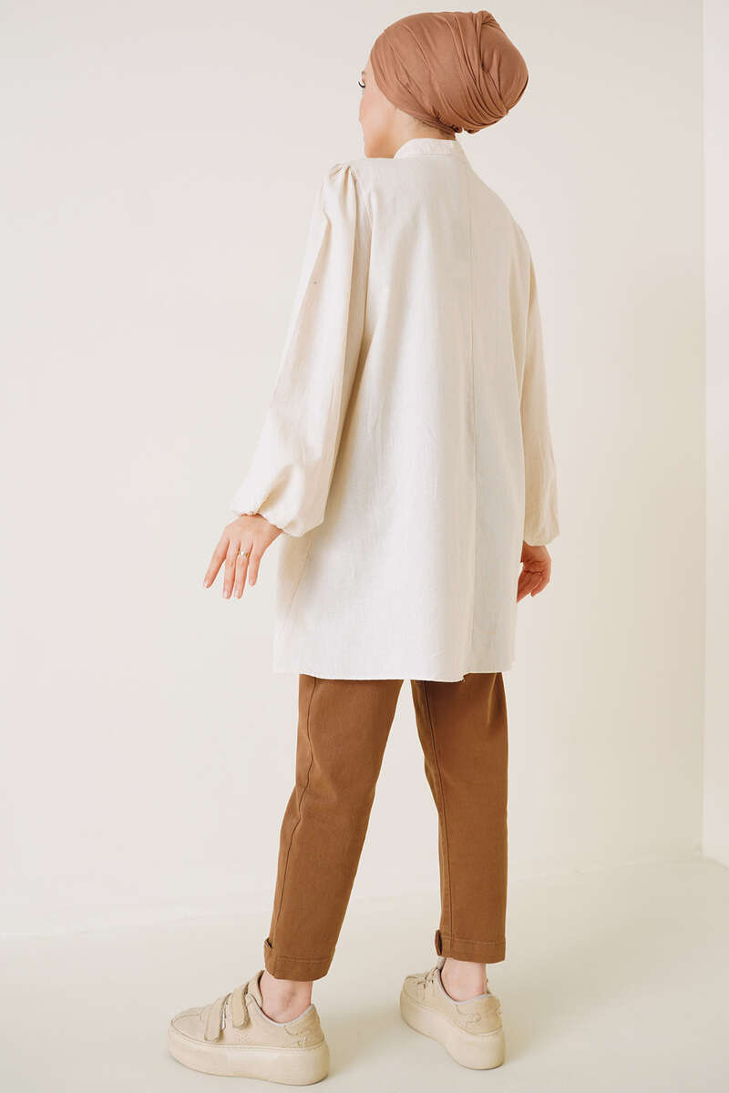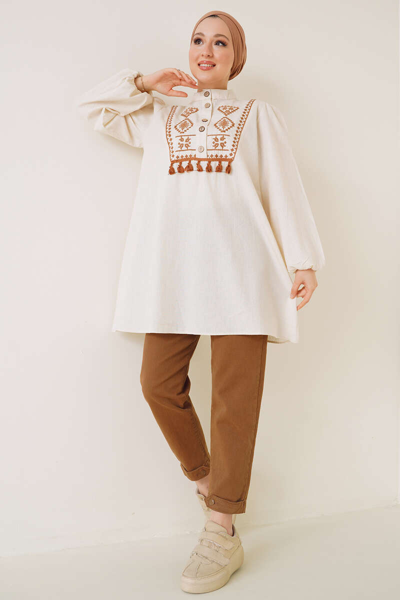 Yeni sezon keten tuniğimiz önünde bulunan nakış işlemeleriyel farklı bir hava kazanmıştır. Hakim yaka olan tuniğimizin yakasına düğmeleri eşlik etmektedir. Bilekleri lastiklidir.