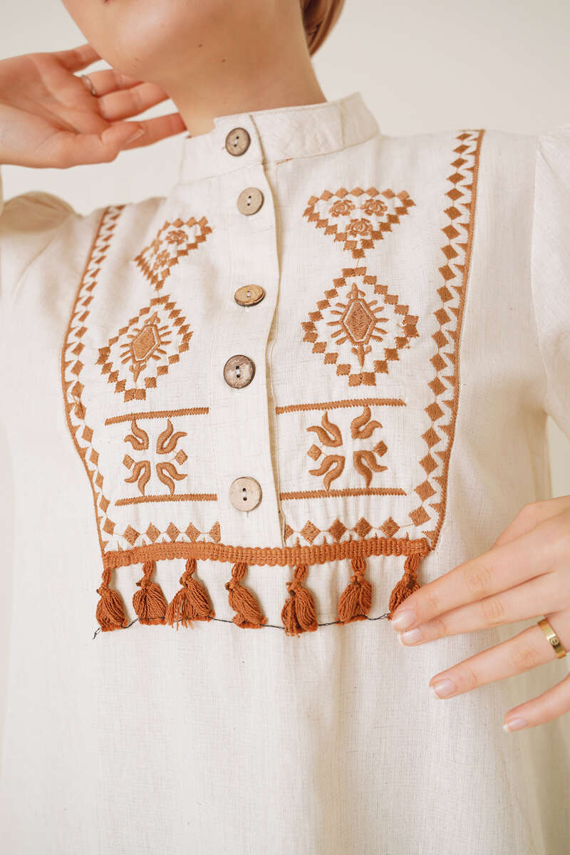 Önü Nakış İşlemeli Püsküllü Keten Tunik