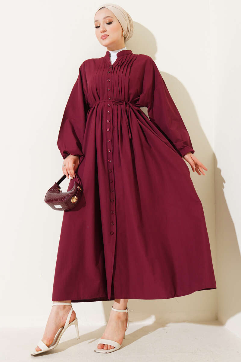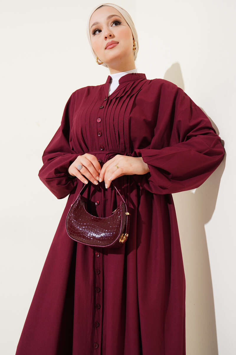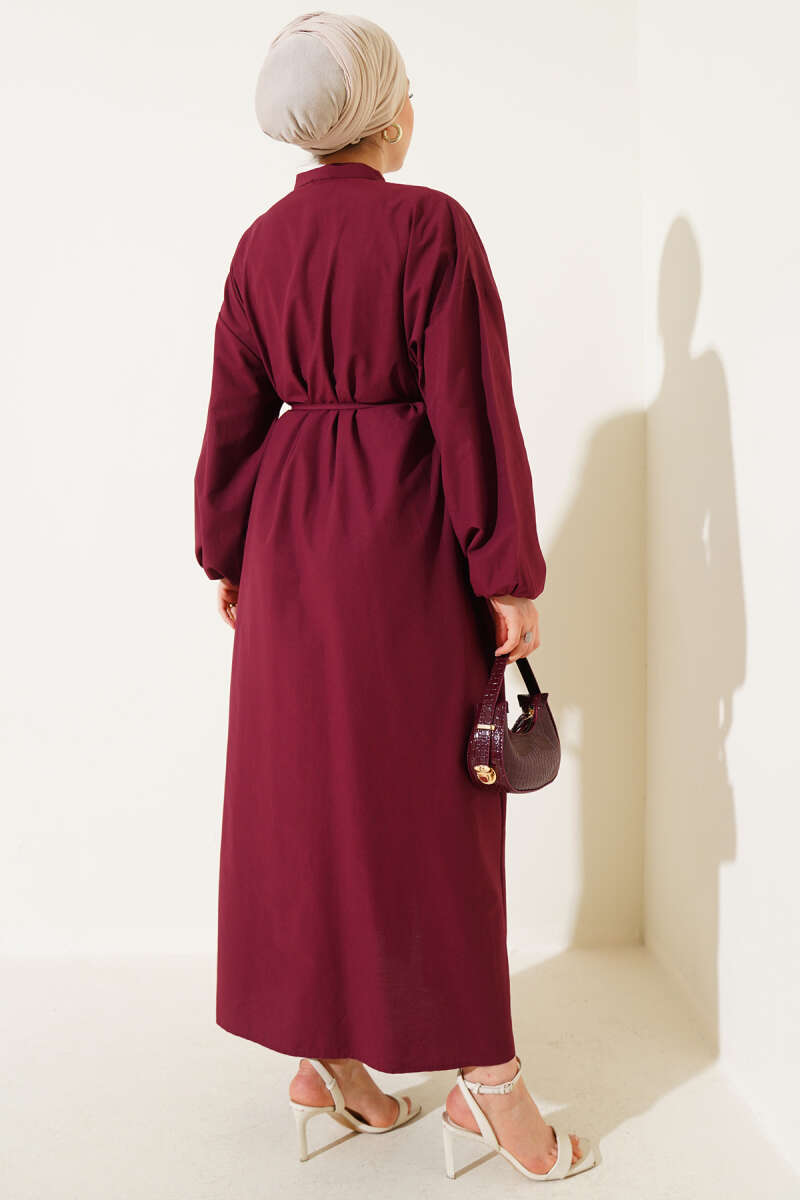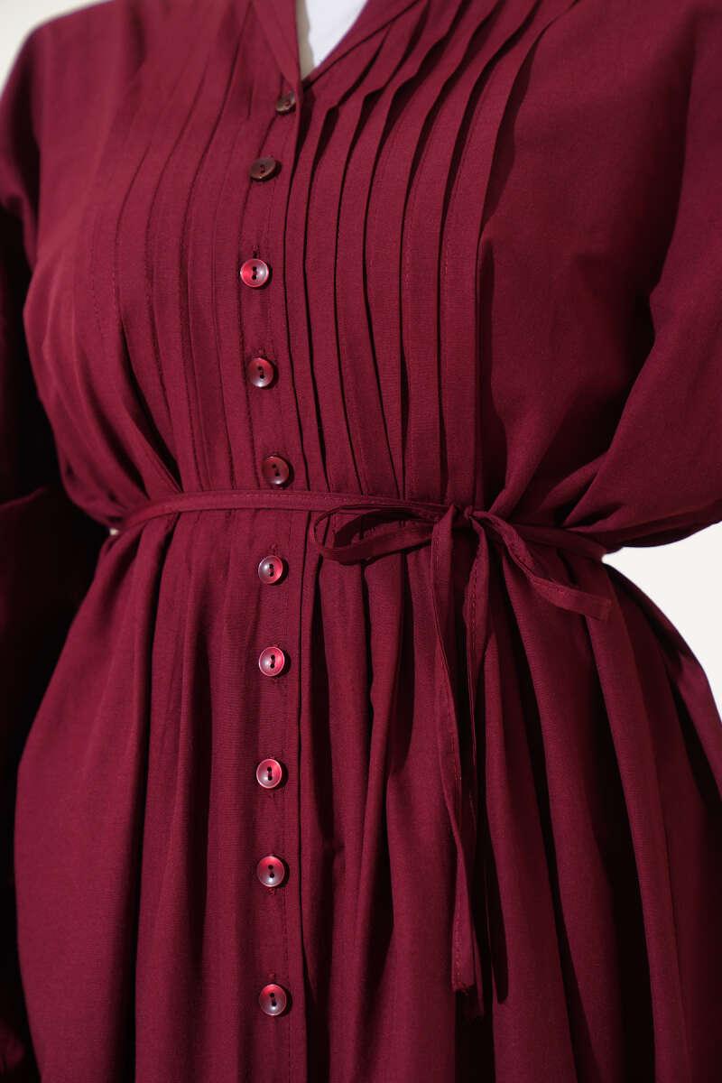 Çizgi Gömlek Garnili Triko Elbise Bordo