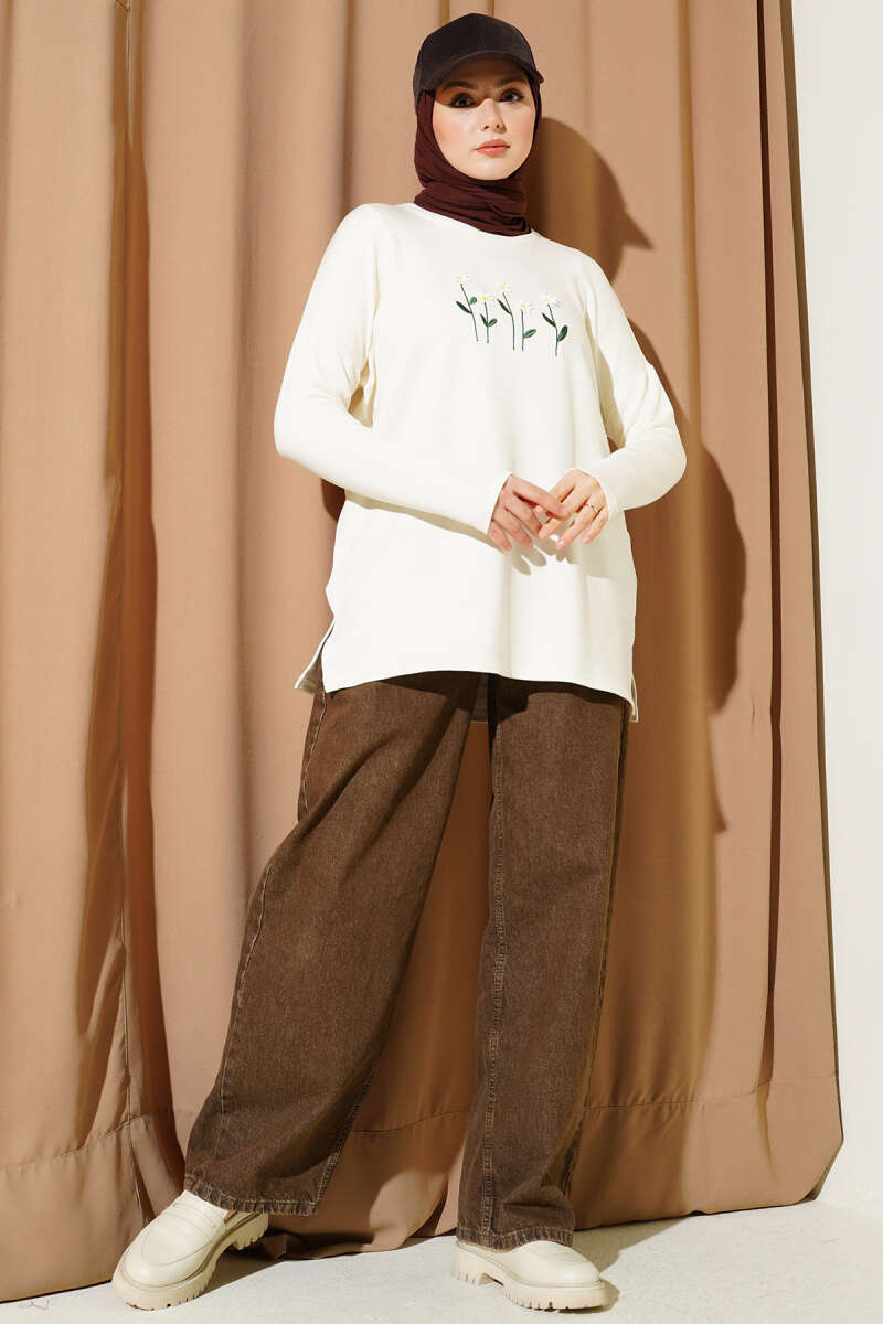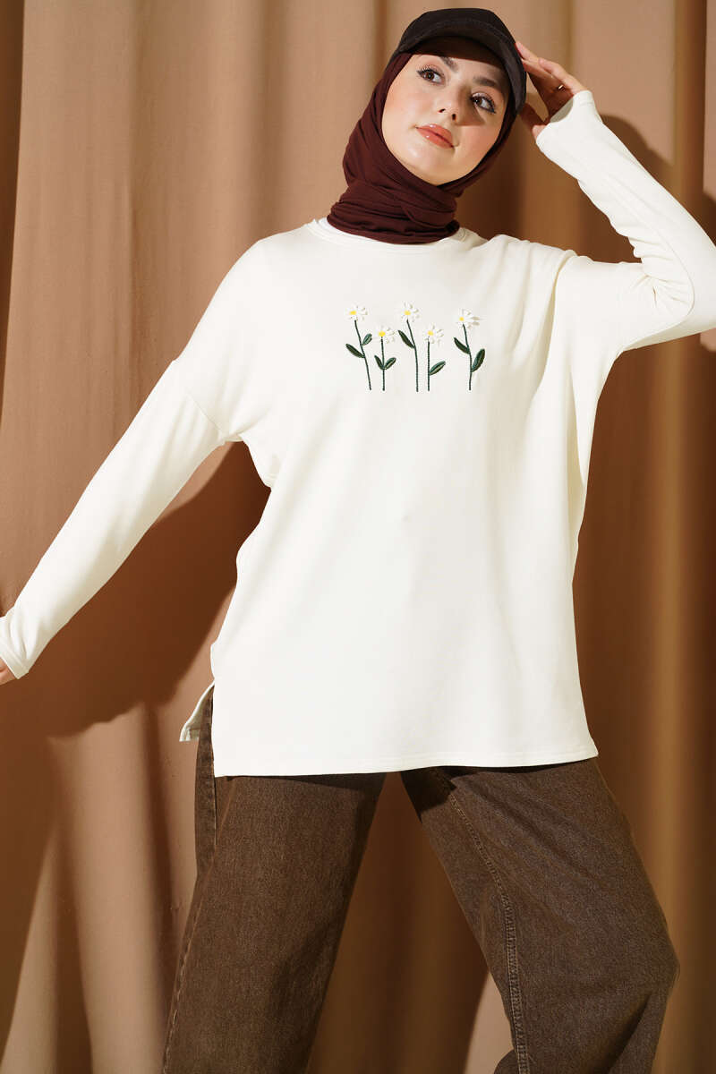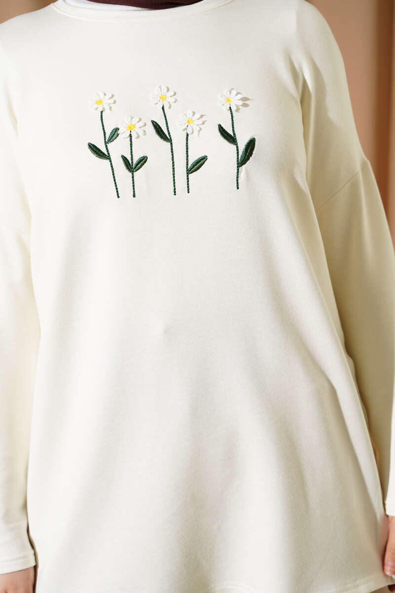 Önü Papatya Nakışlı Tunik Ekru
