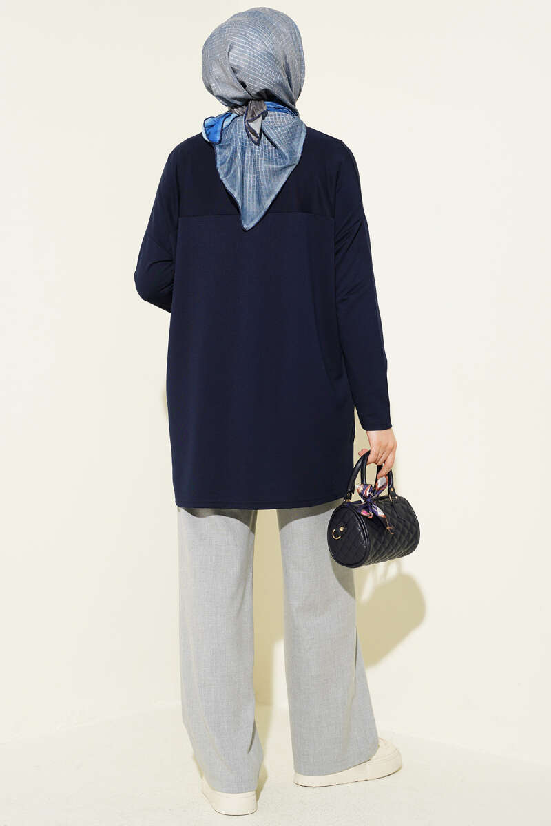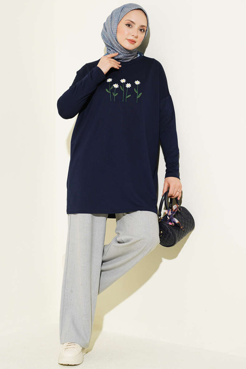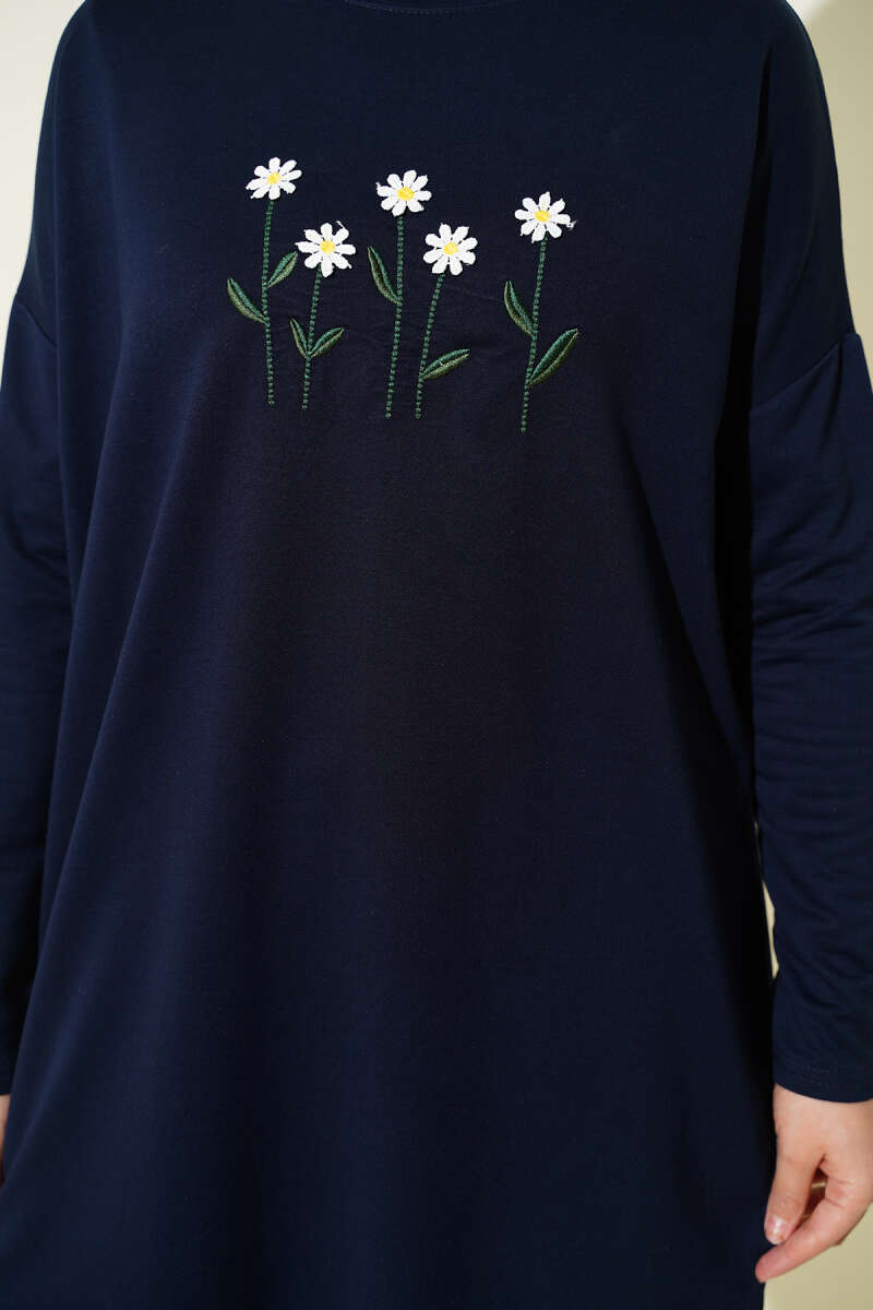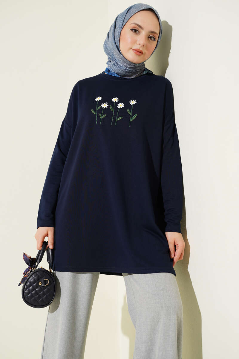 Önü Papatya Nakışlı Tunik Lacivert