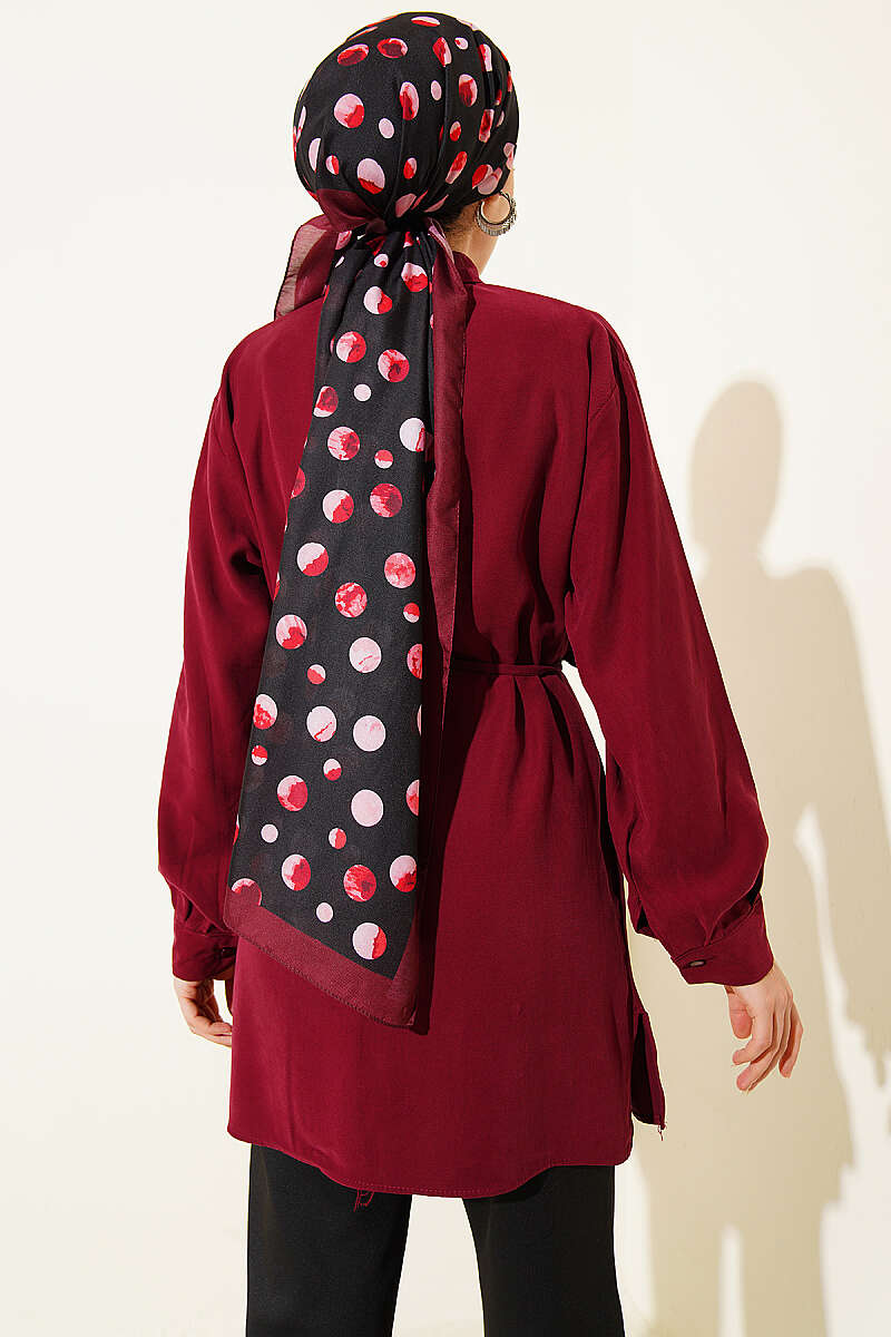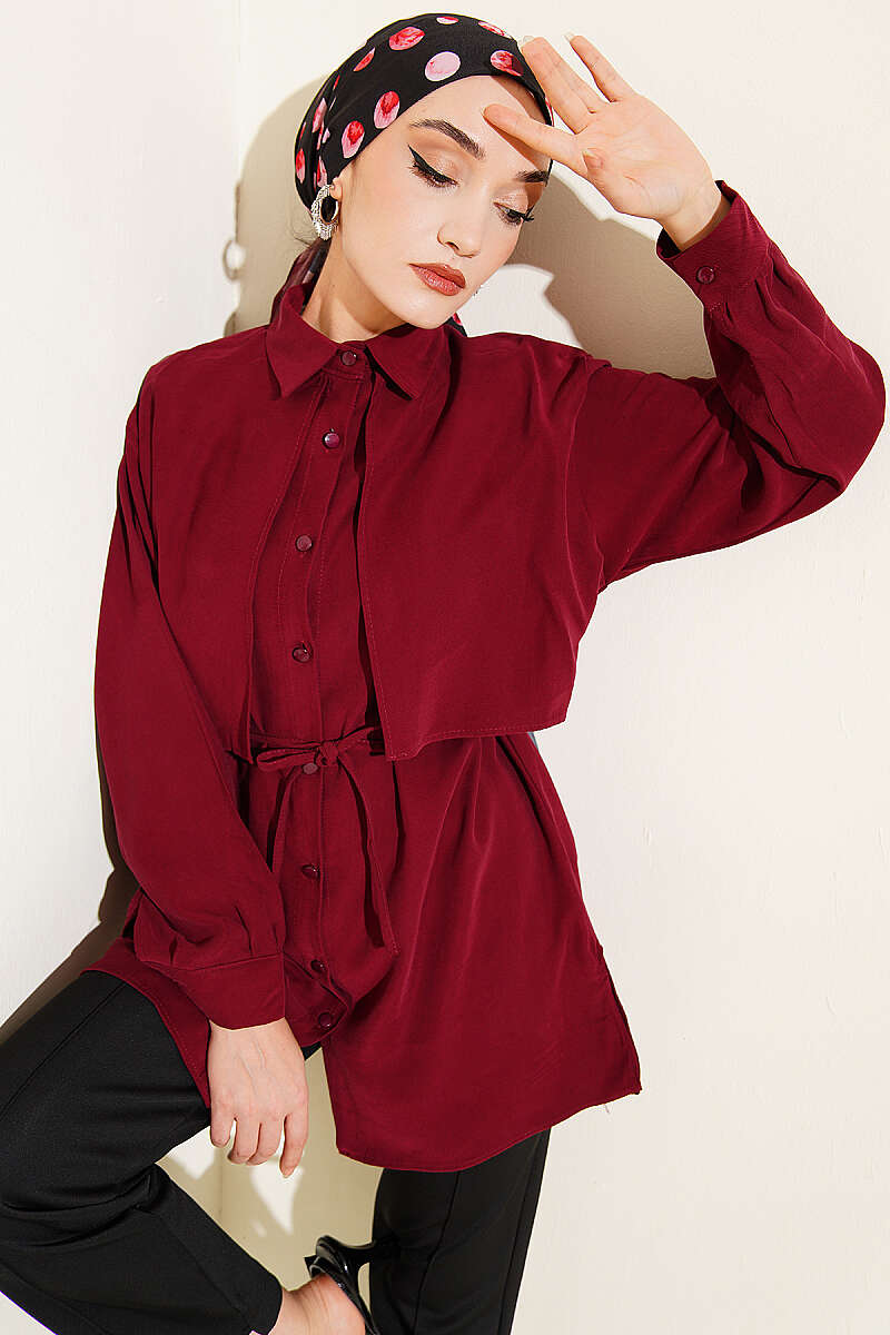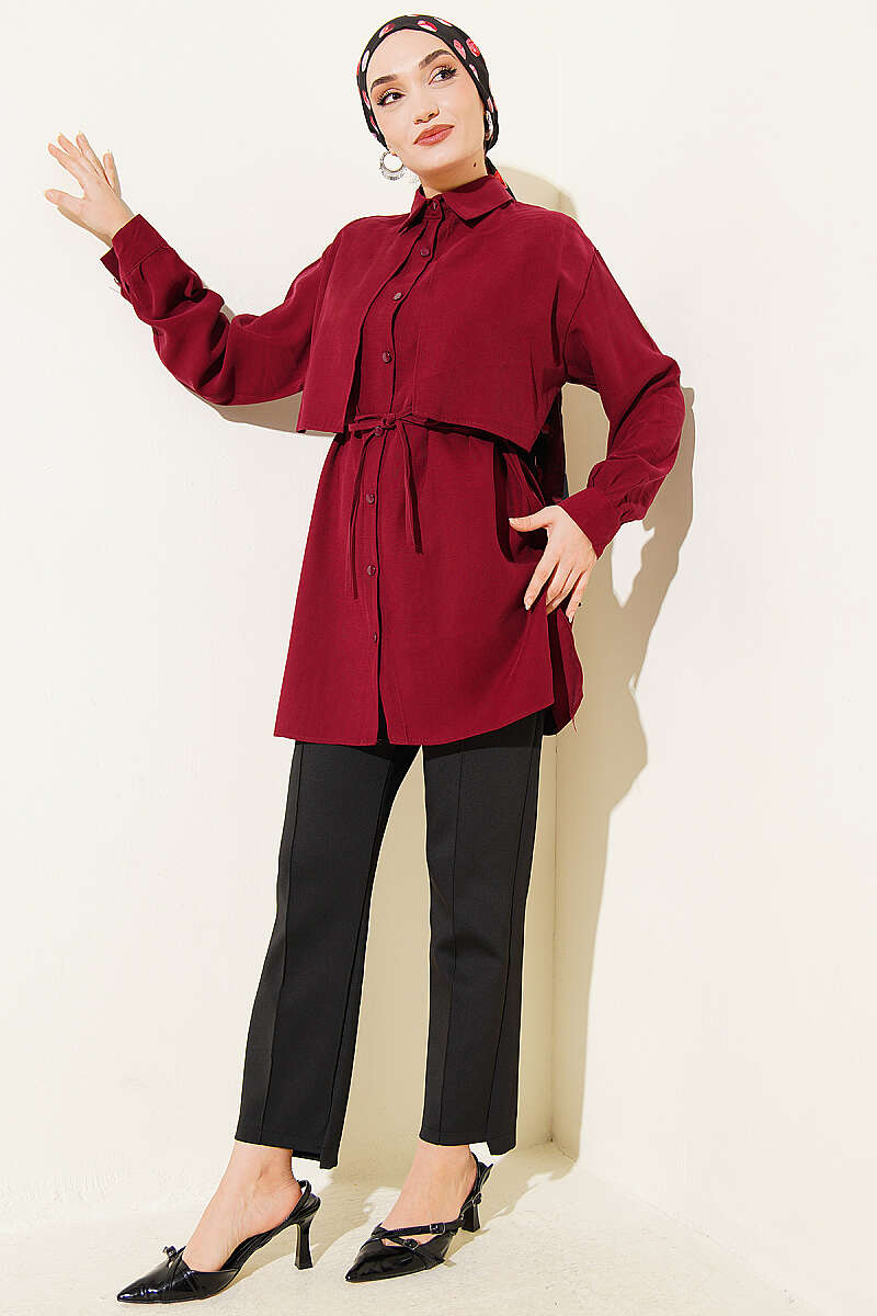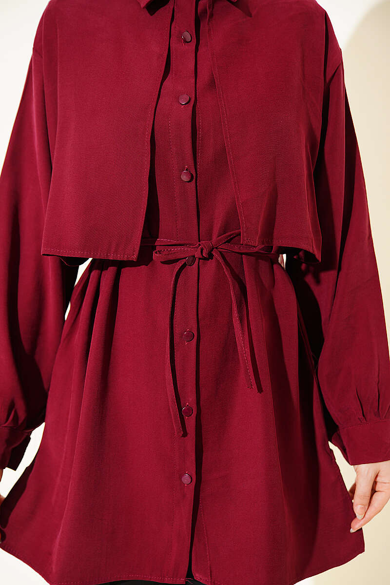 Önü Pelerinli İp Kuşaklı Tensel Gömlek Bordo