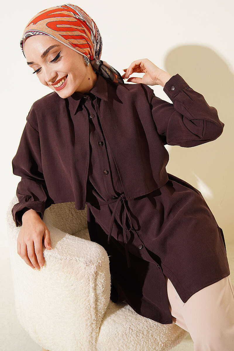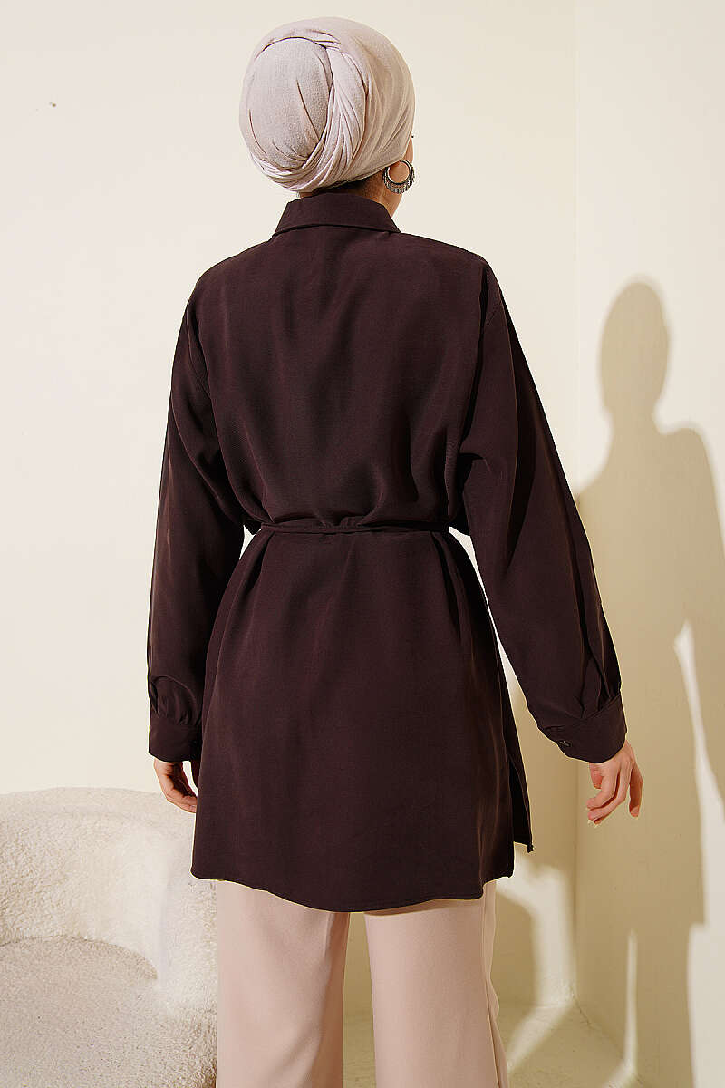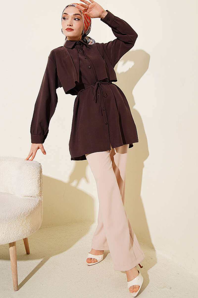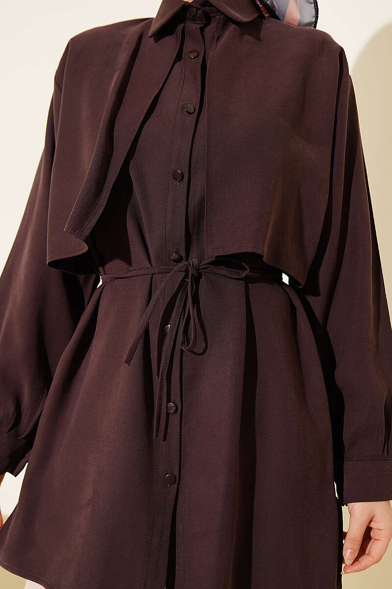Önü Pelerinli İp Kuşaklı Tensel Gömlek Kahve