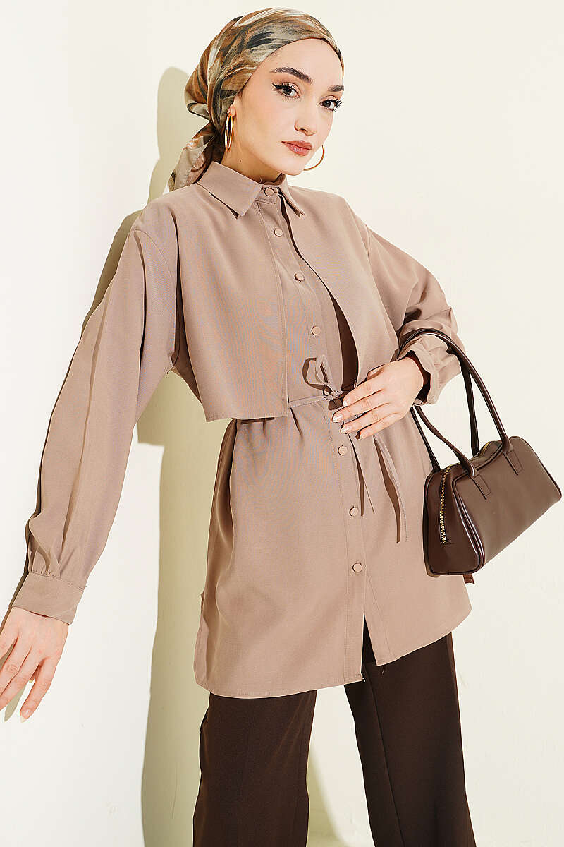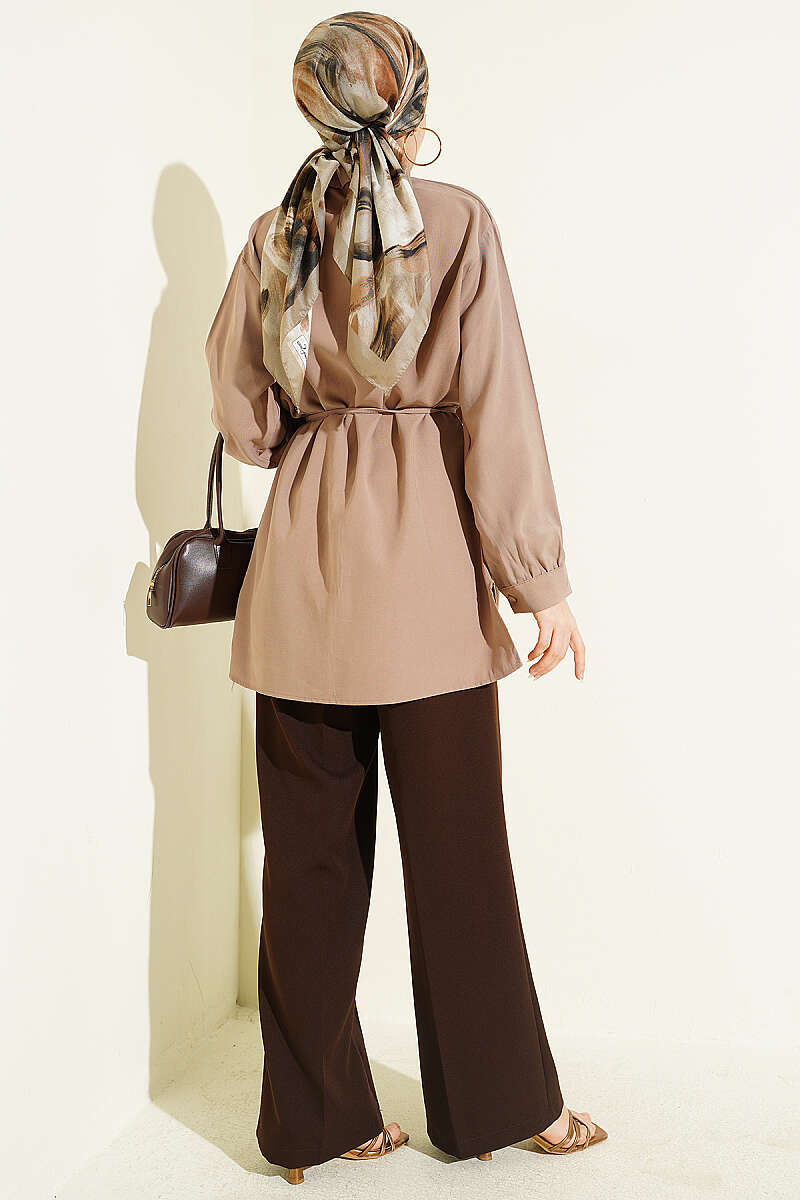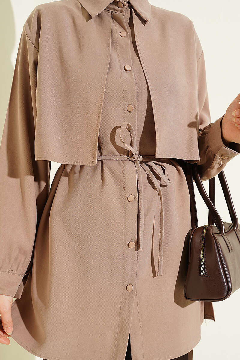 Önü Pelerinli İp Kuşaklı Tensel Gömlek Vizon