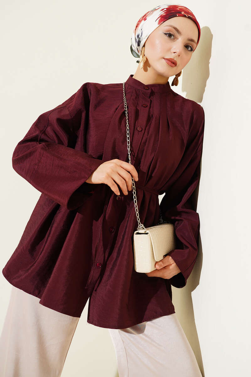 Geniş Kuşaklı Büzgülü Gömlek Bordo