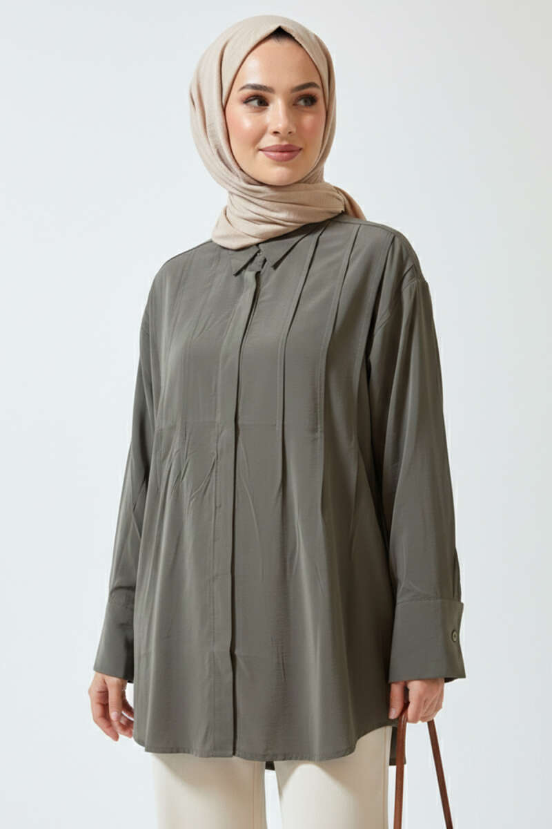 Önü Pile Detaylı Tensel Gömlek Haki