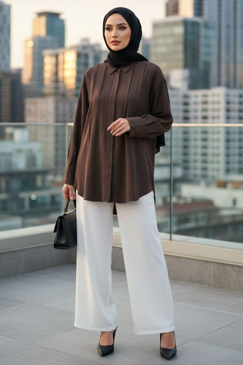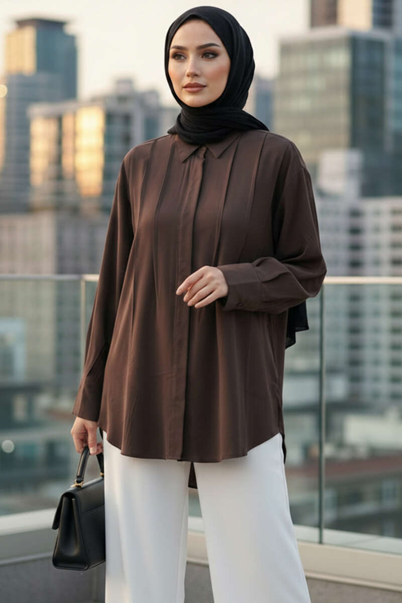 Önü Pile Detaylı Tensel Gömlek Kahve