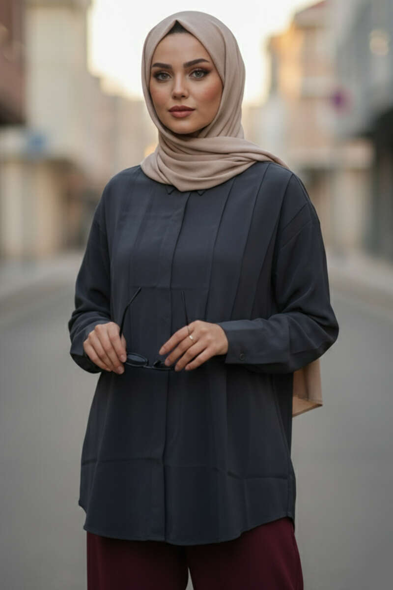 Önü Pile Detaylı Tensel Gömlek Lacivert