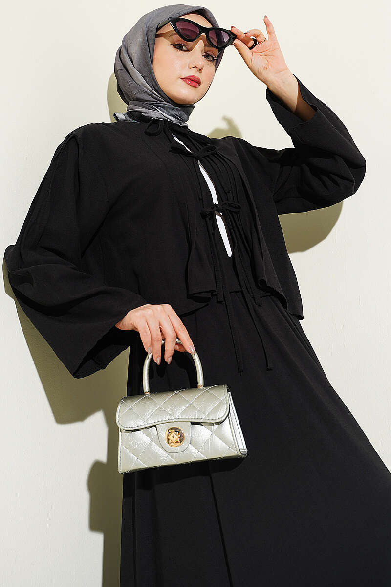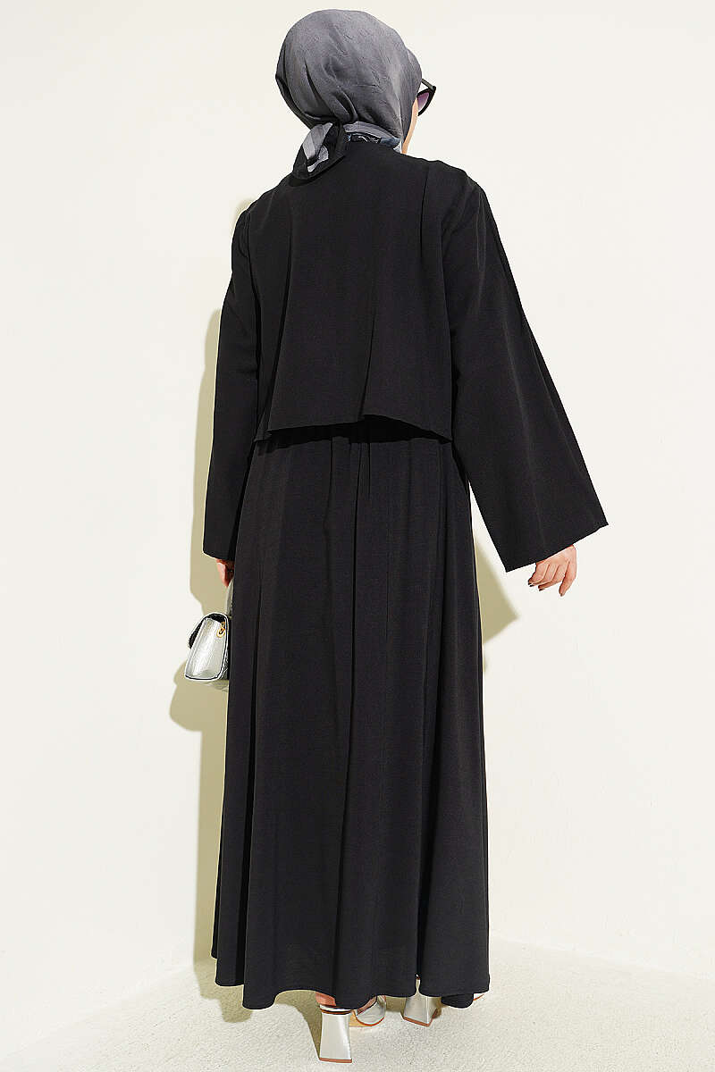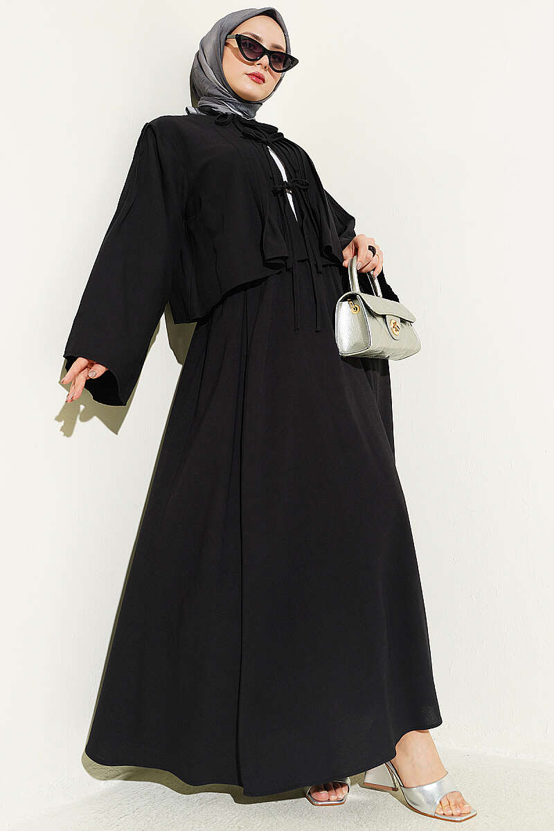Önü Pileli Bağcıklı Etekli Takım Siyah