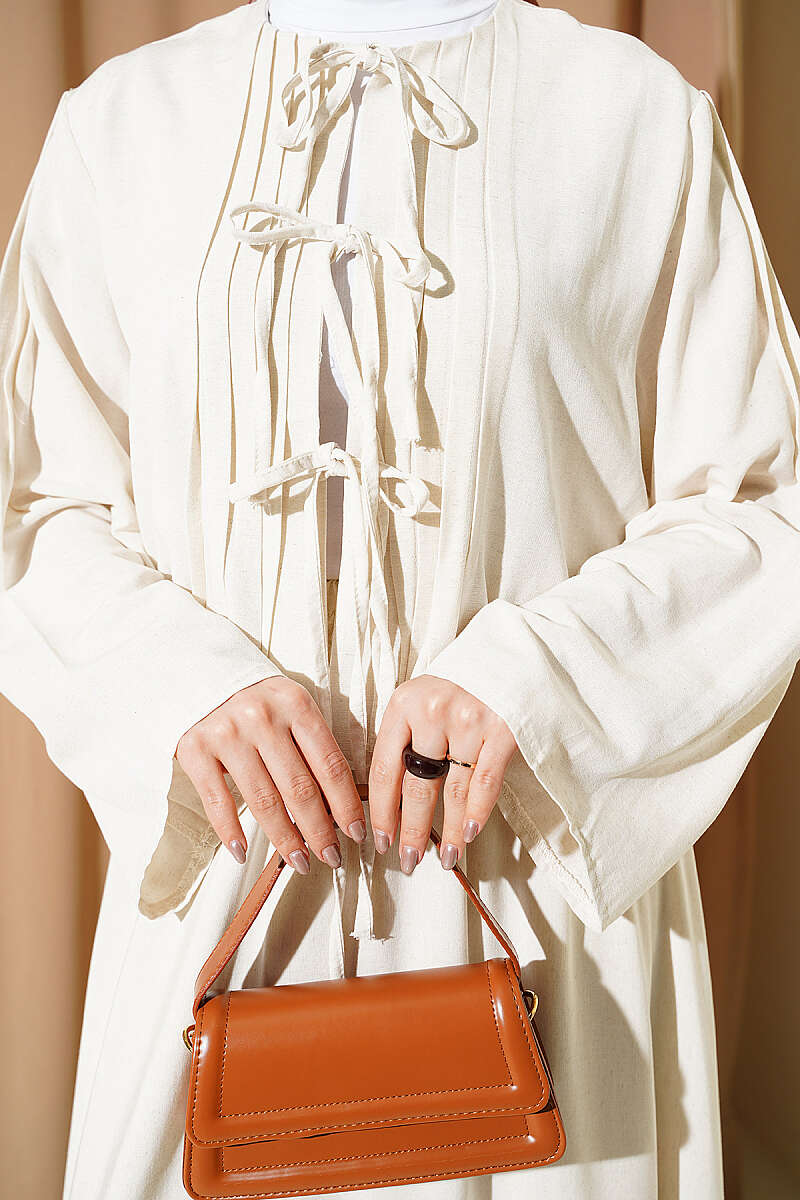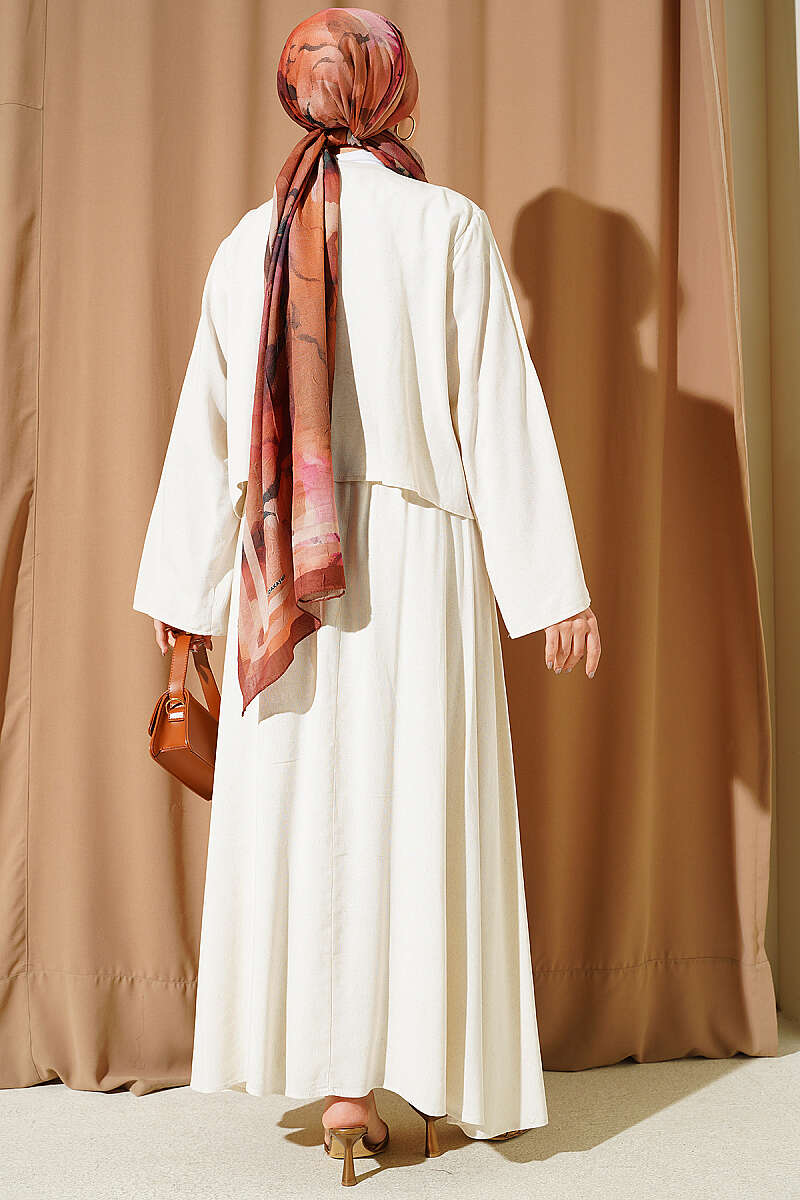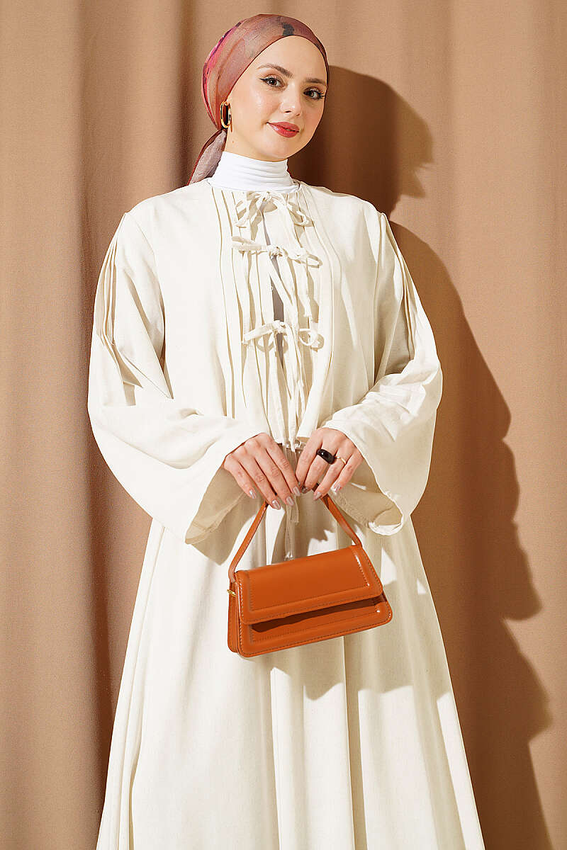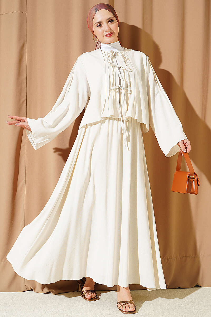 Ön kısmındaki zarif pile detayları ve estetik bağlama özellikleriyle dikkat çeken bu takım, geleneksel dokunuşları modern bir formla birleştiriyor. Üst parçanın dökümlü yapısı ve omuzlardaki ince büzgüler, geniş kesim etekle birleşerek hem asil hem de konforlu bir silüet oluşturuyor. Dokulu kumaş yapısı sayesinde gün boyu formunu koruyan bu ikili set, özel günlerden günlük şıklığa kadar geniş bir kullanım yelpazesi sunuyor. Çabasız zarafet arayanlar için tasarlanan bu parça, bütünsel bir stil sunarak gardırobunuzun en seçkin takımlarından biri olmaya adaydır.