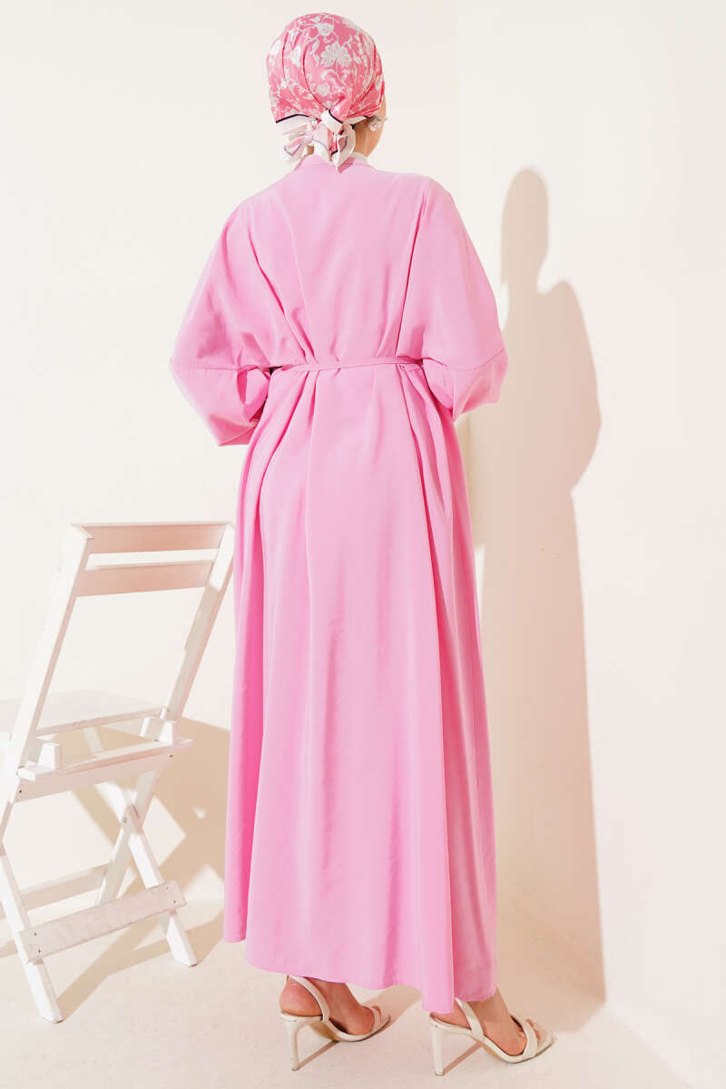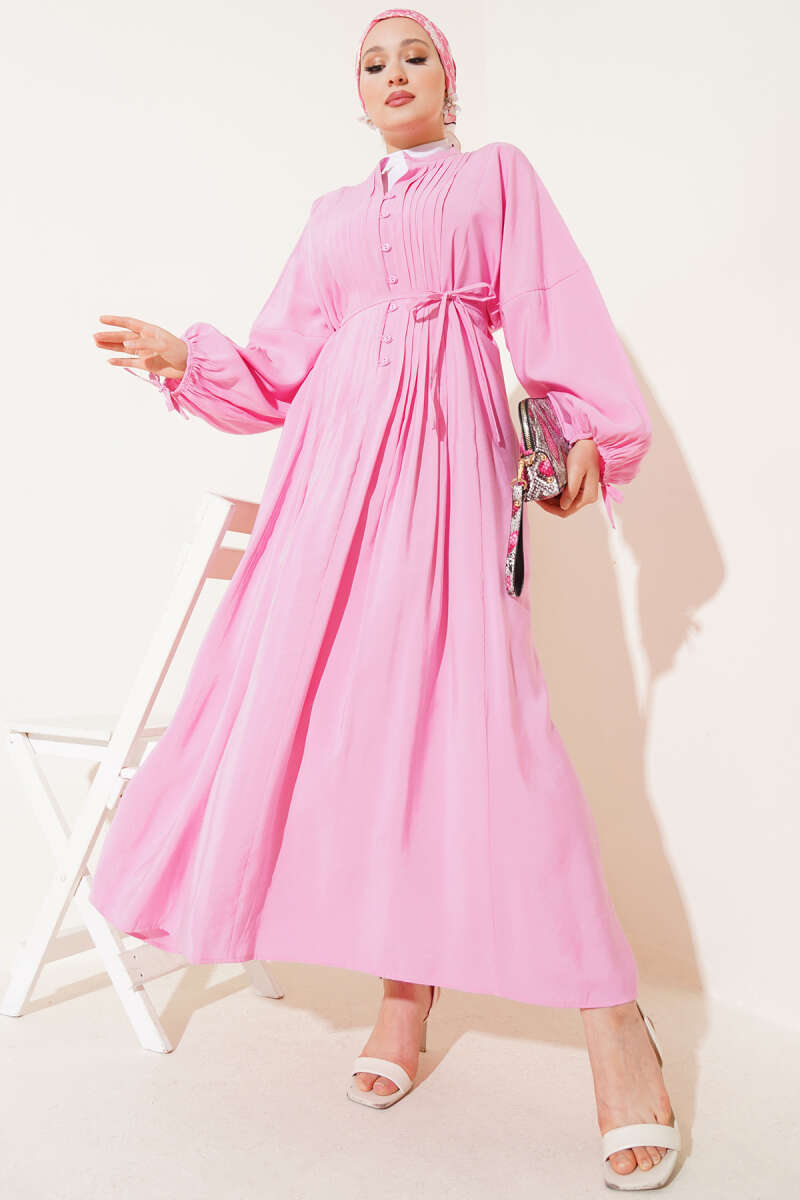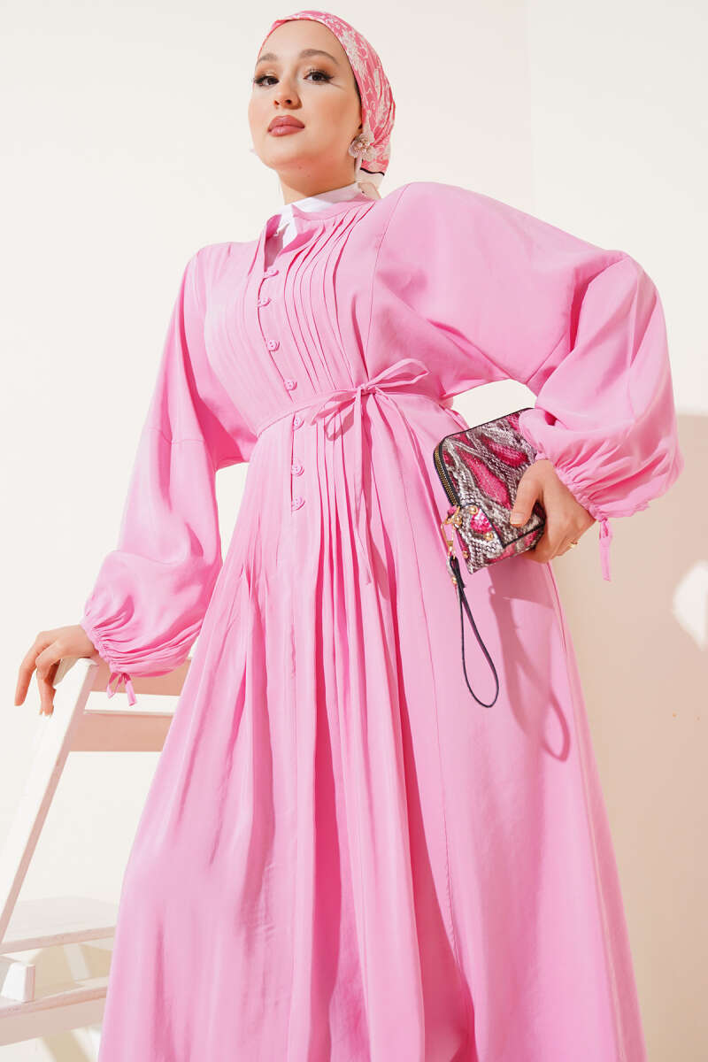 Önü Pileli Brit Düğmeli Elbise Pembe