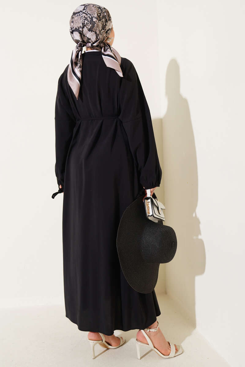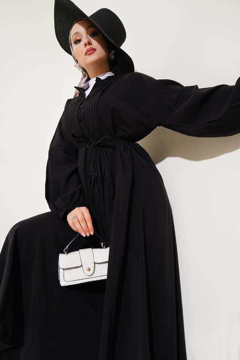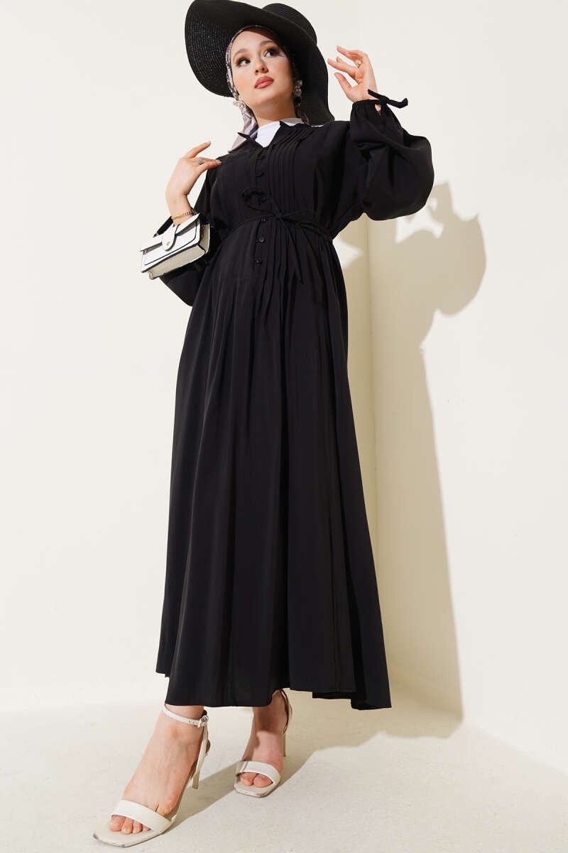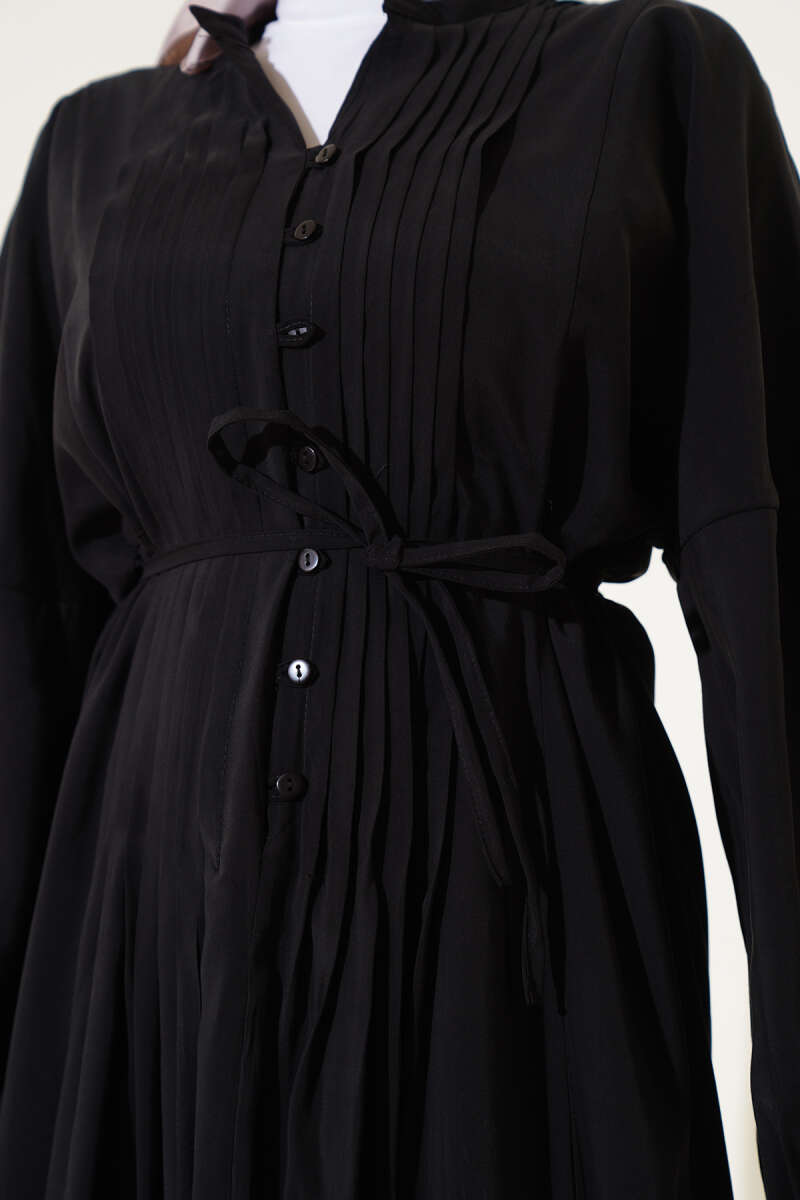 Önü Pileli Brit Düğmeli Elbise Siyah