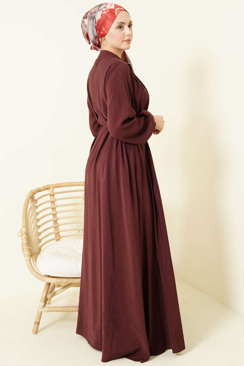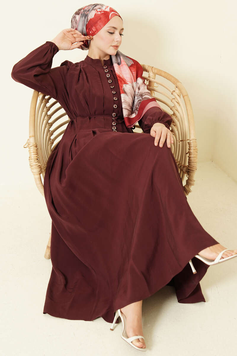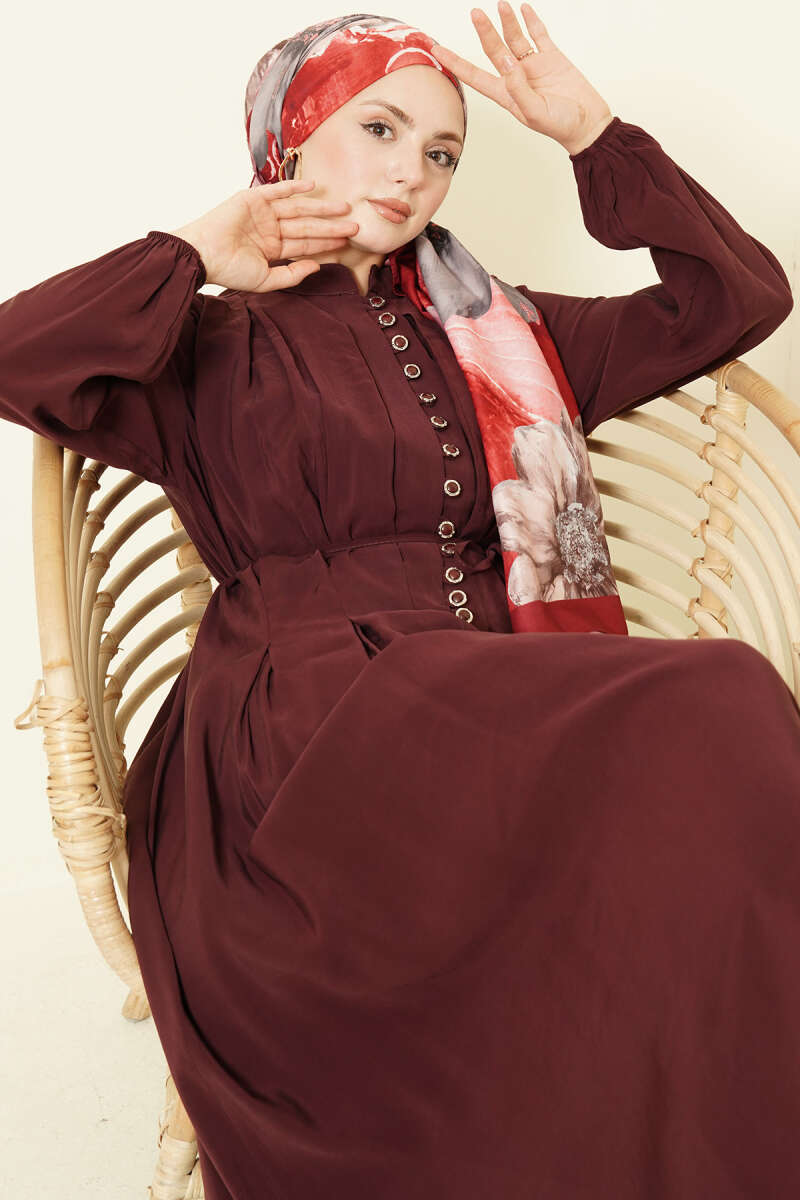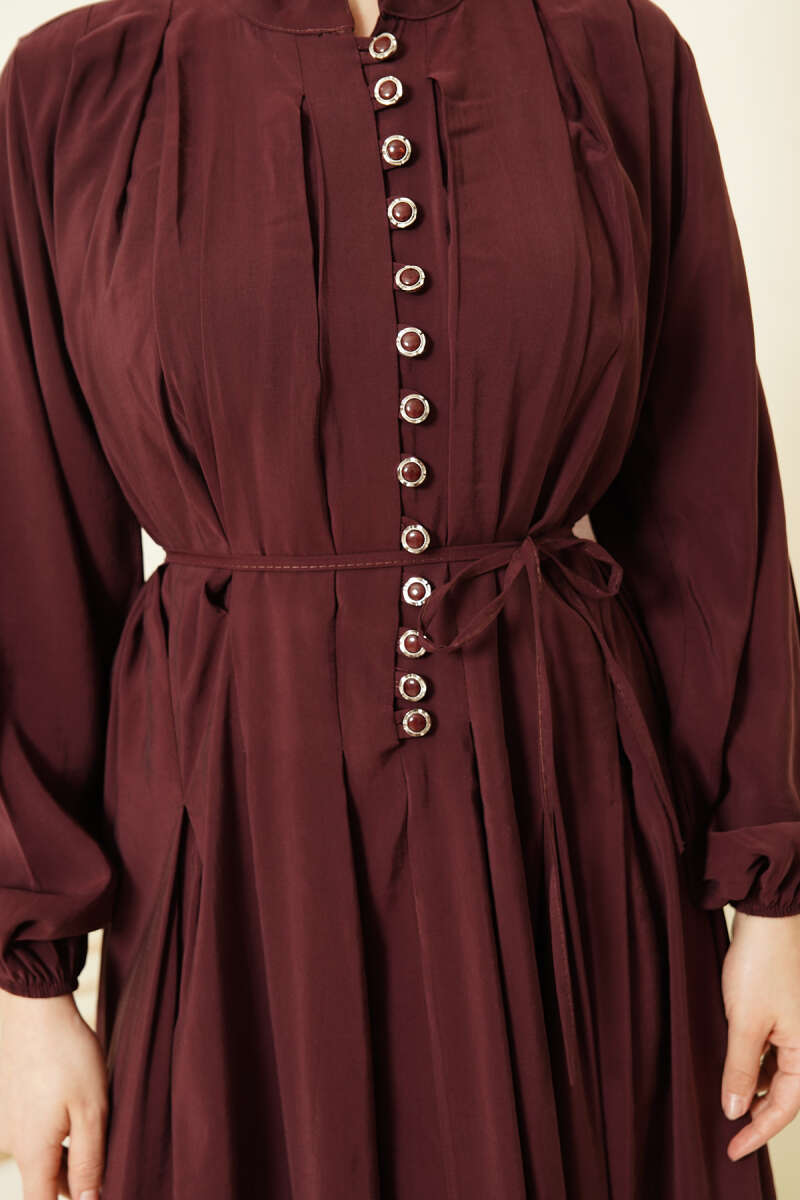 Önü Pileli Düğmeli Modal Elbise Bordo