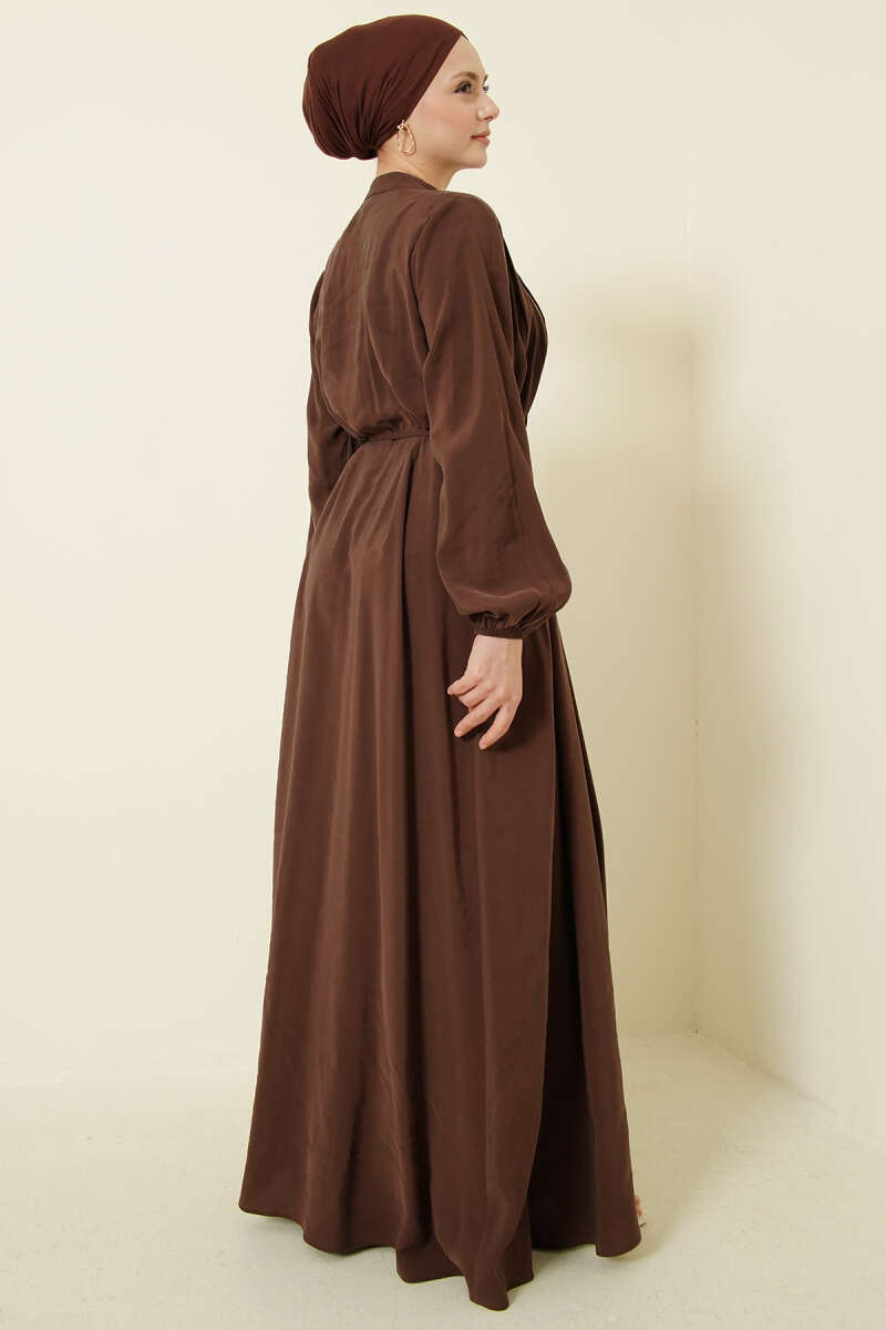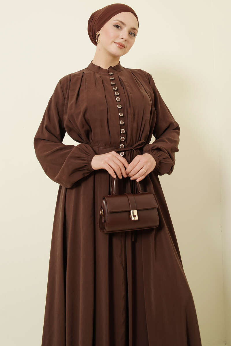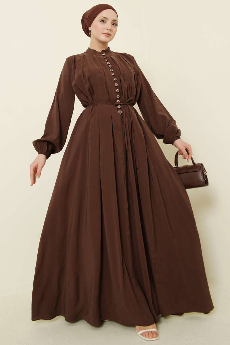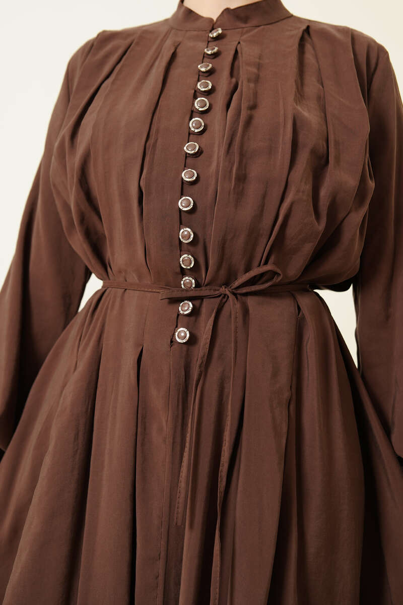 Önü Pileli Düğmeli Modal Elbise Kahve