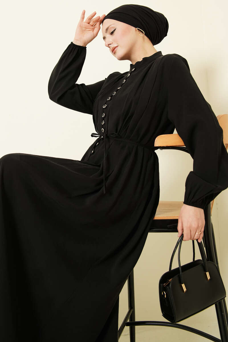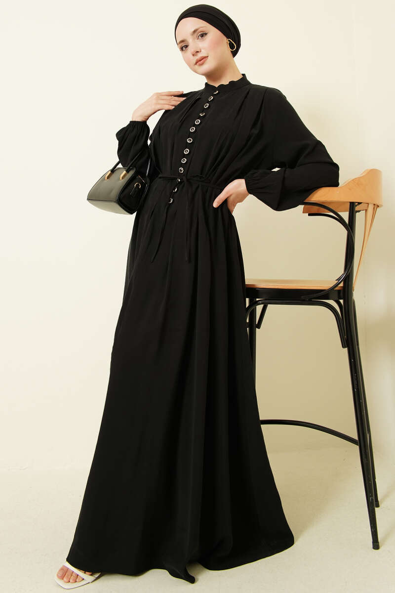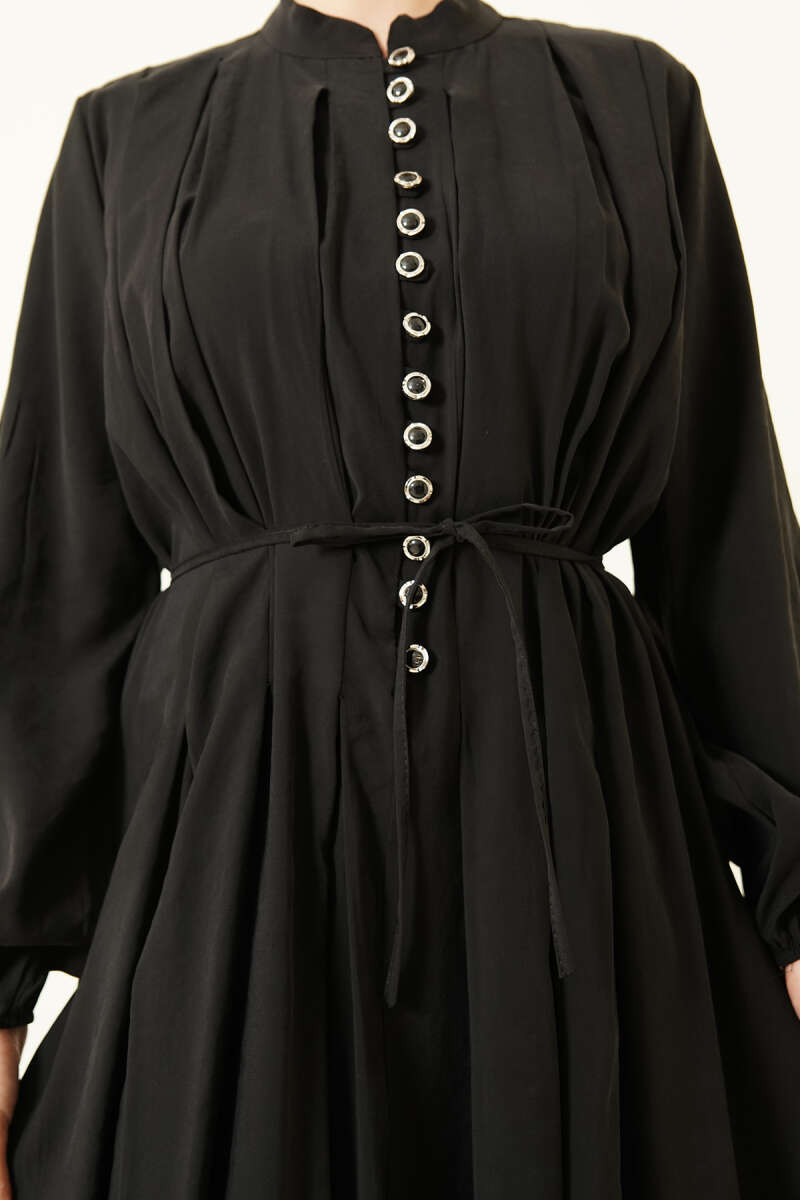 Önü Pileli Düğmeli Modal Elbise Siyah
