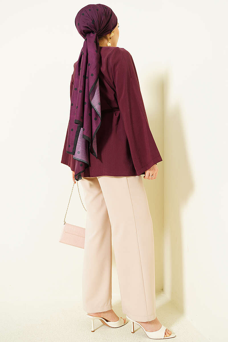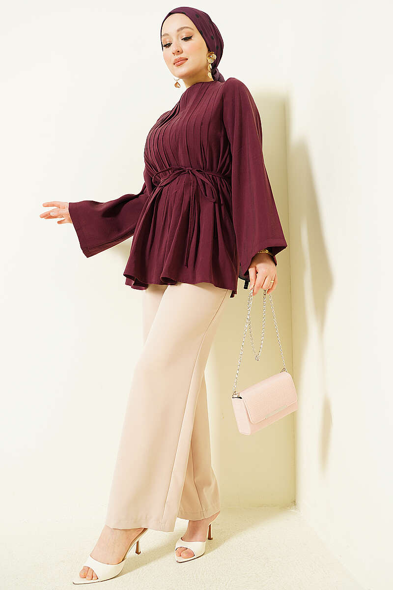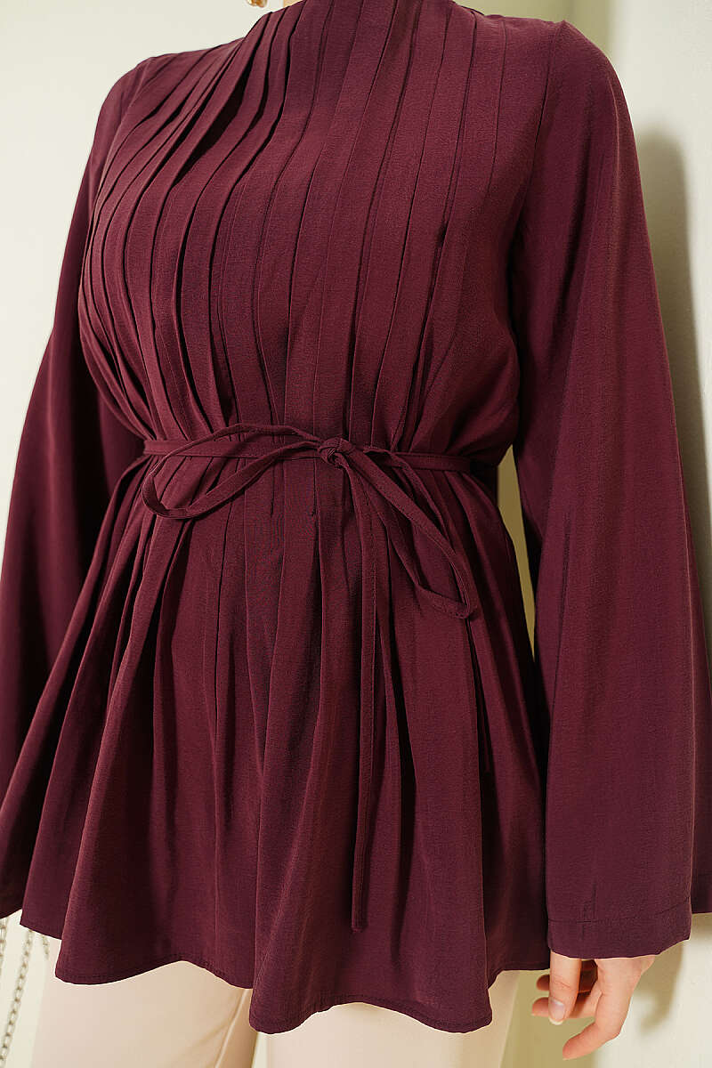 Önü Pileli İp Kuşaklı Tunik Bordo