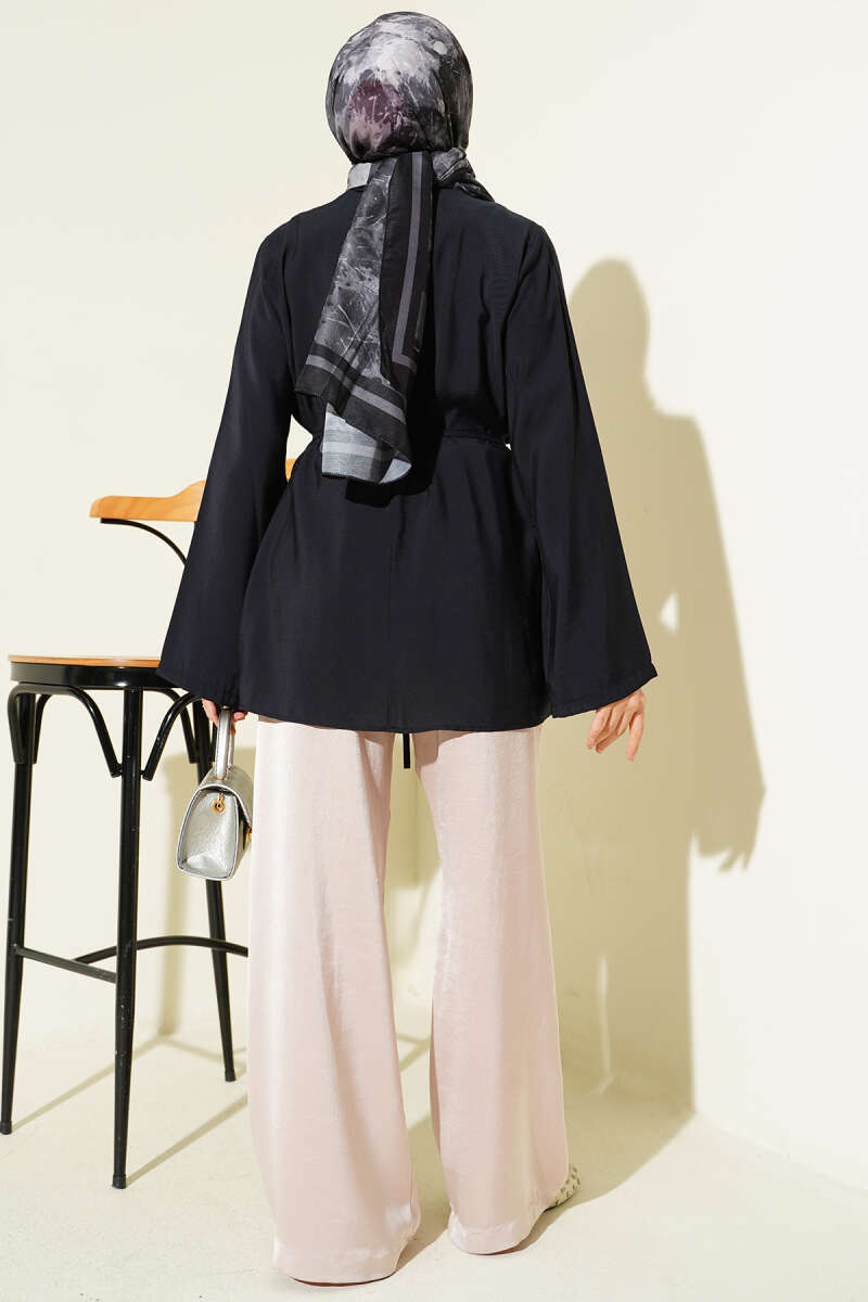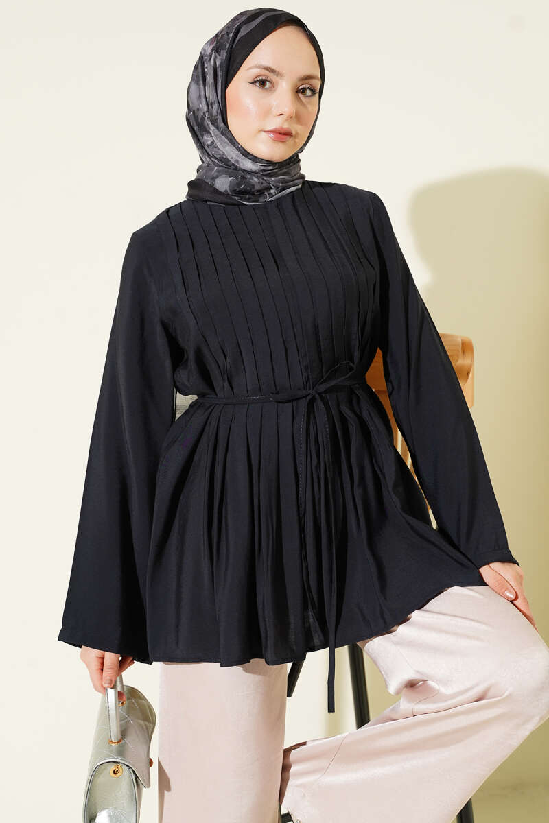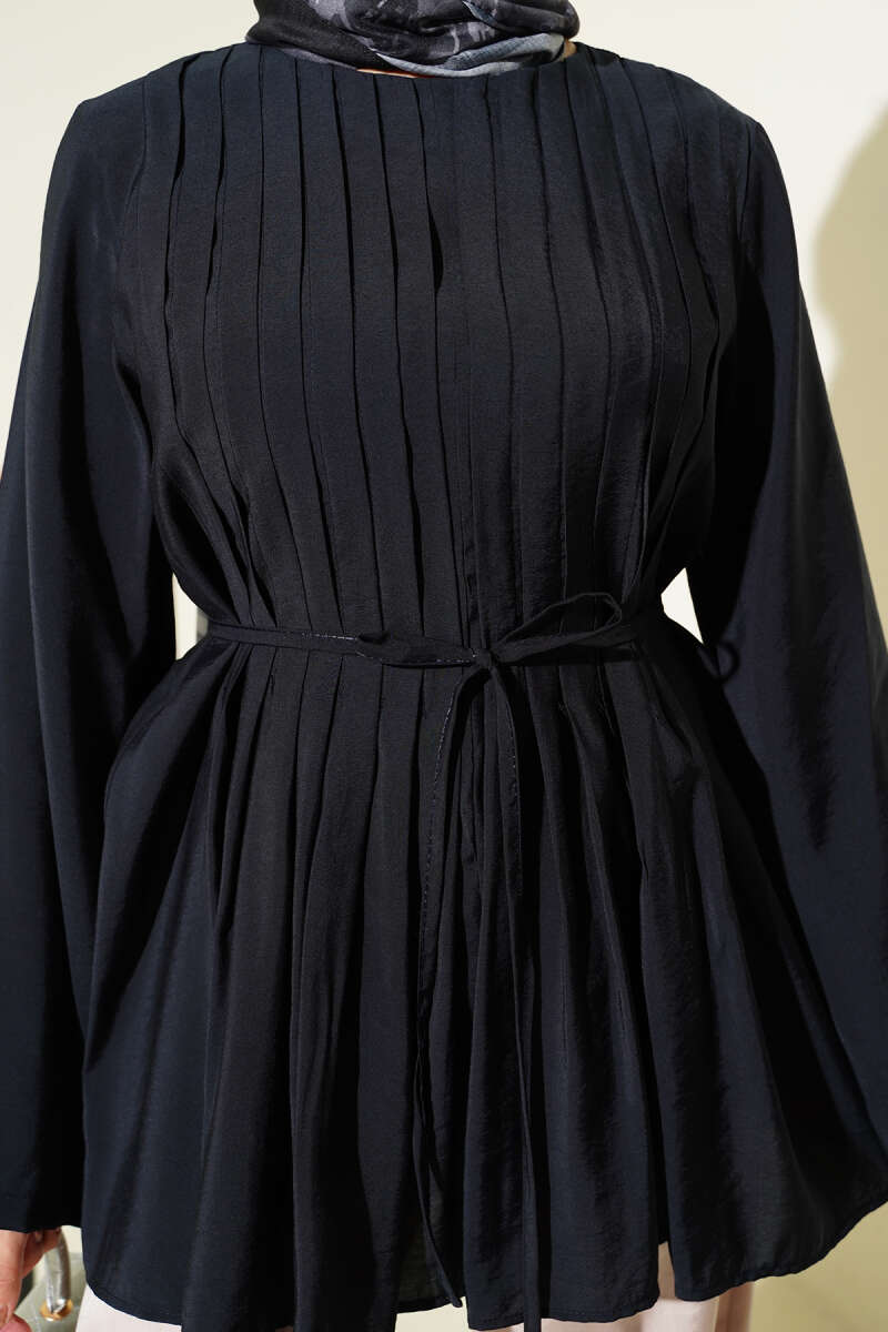 Önü Pileli İp Kuşaklı Tunik Lacivert