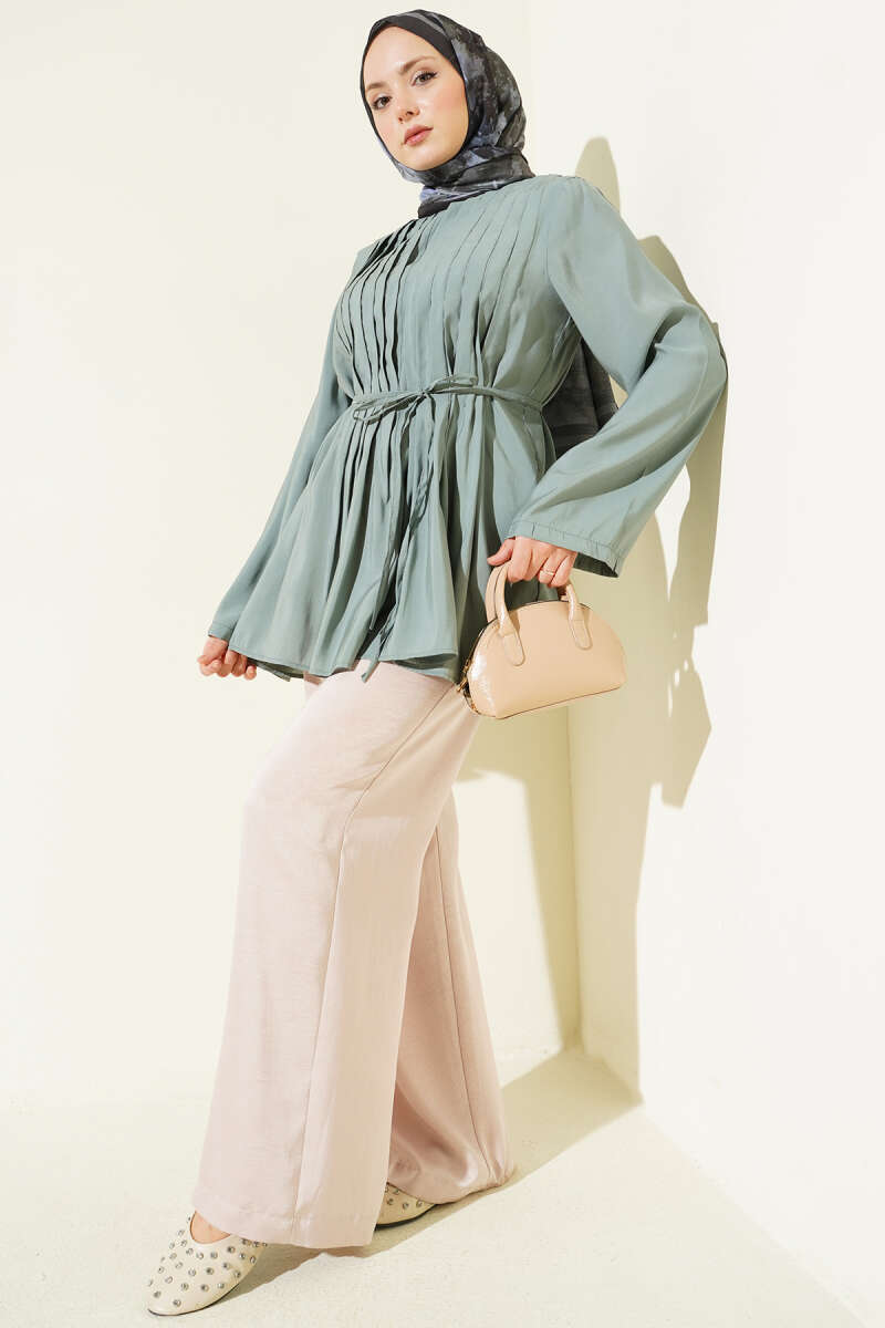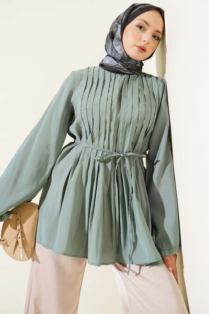 Önü Pileli İp Kuşaklı Tunik Bordo