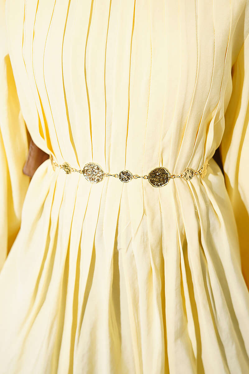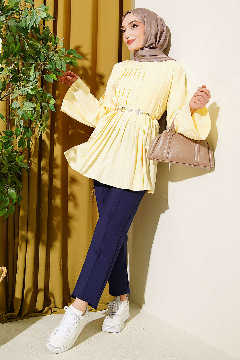 Önü Pileli İp Kuşaklı Tunik Sarı