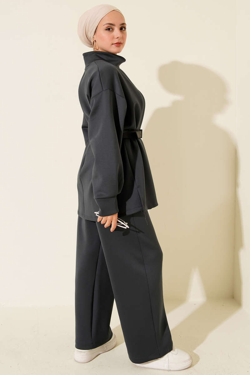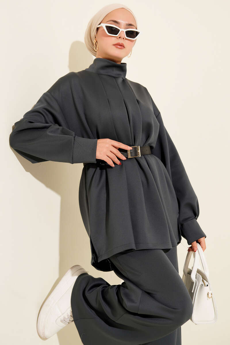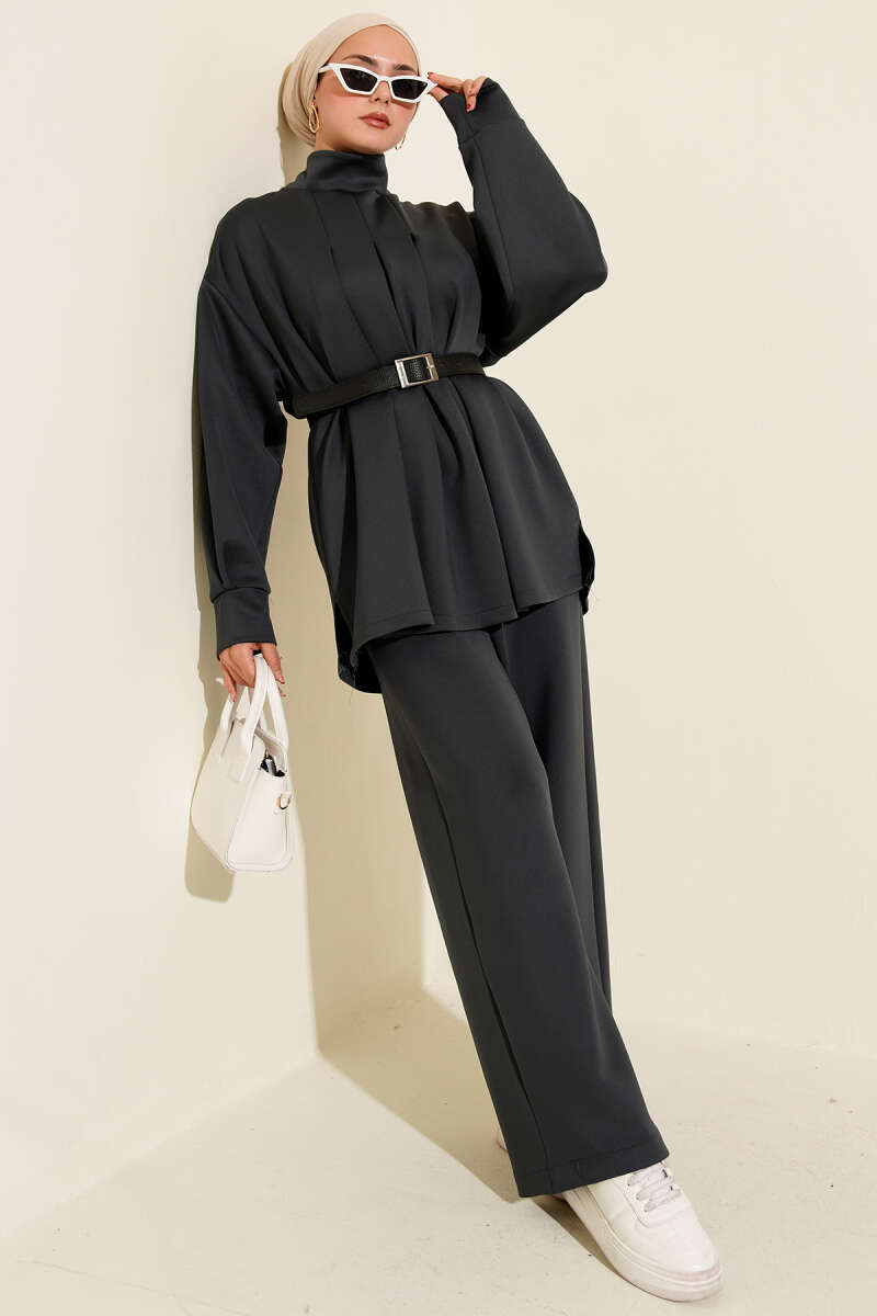 Önü Pileli Kemerli Scuba İkili Takım Füme
