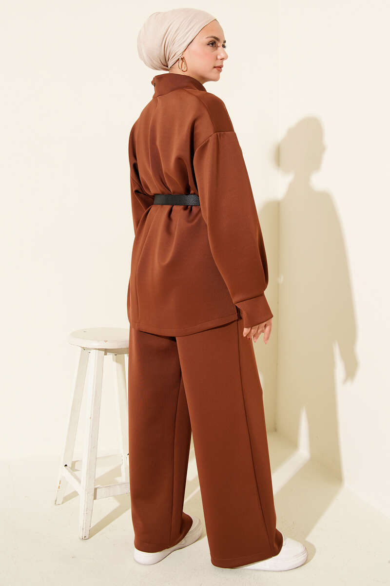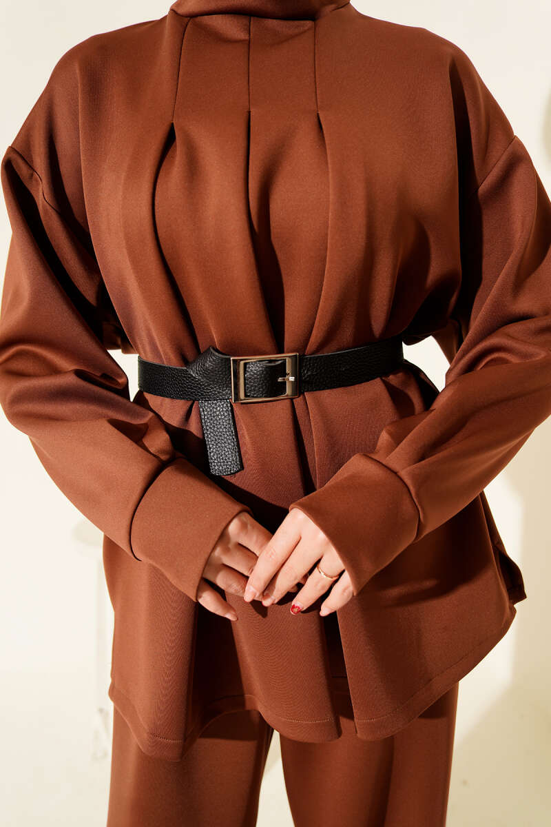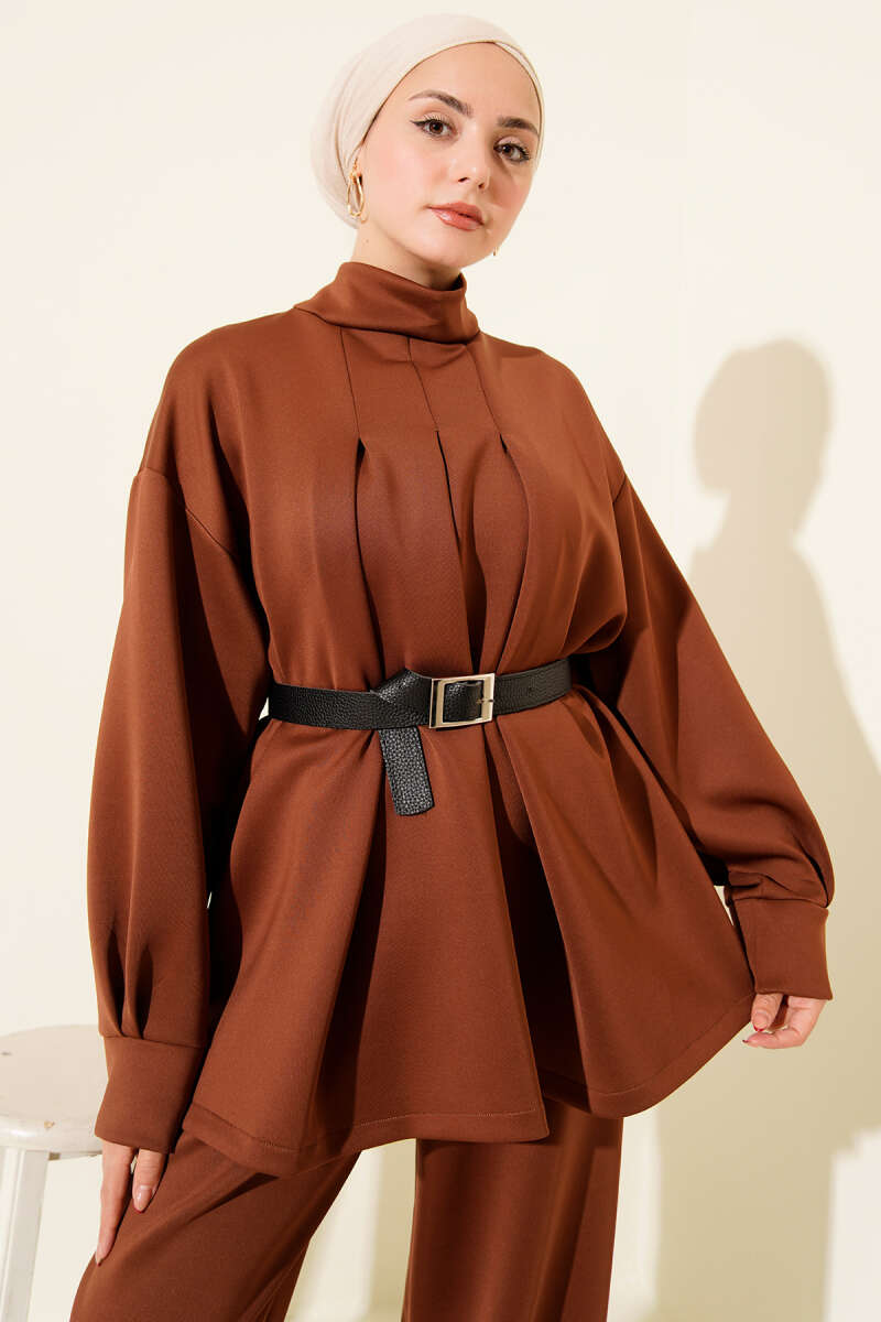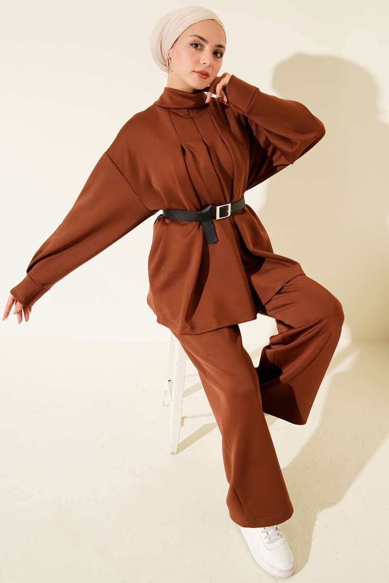 Önü Pileli Kemerli Scuba İkili Takım Kahve