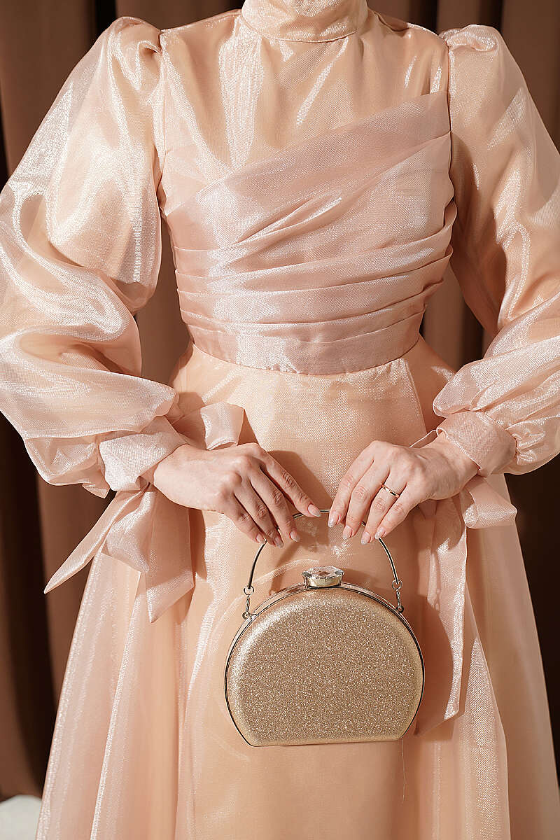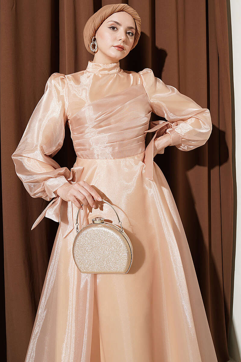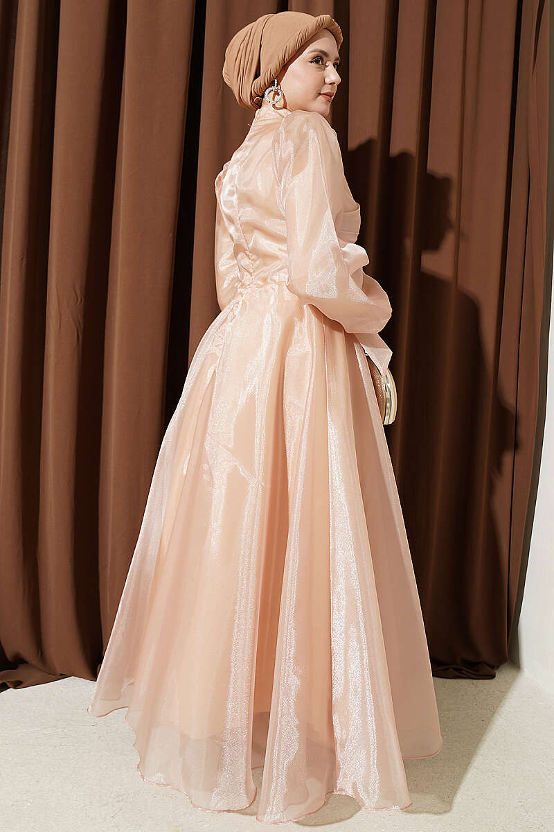 Çiçek Kabartmalı Hakim Yaka Katlı Elbise Vizon