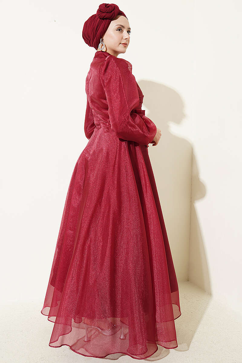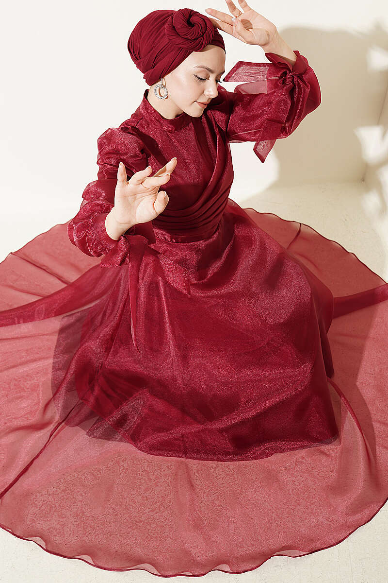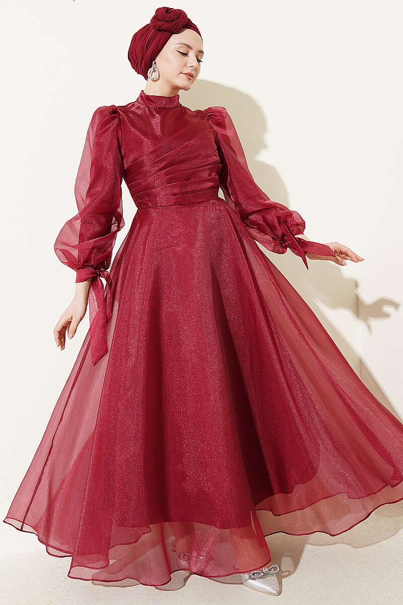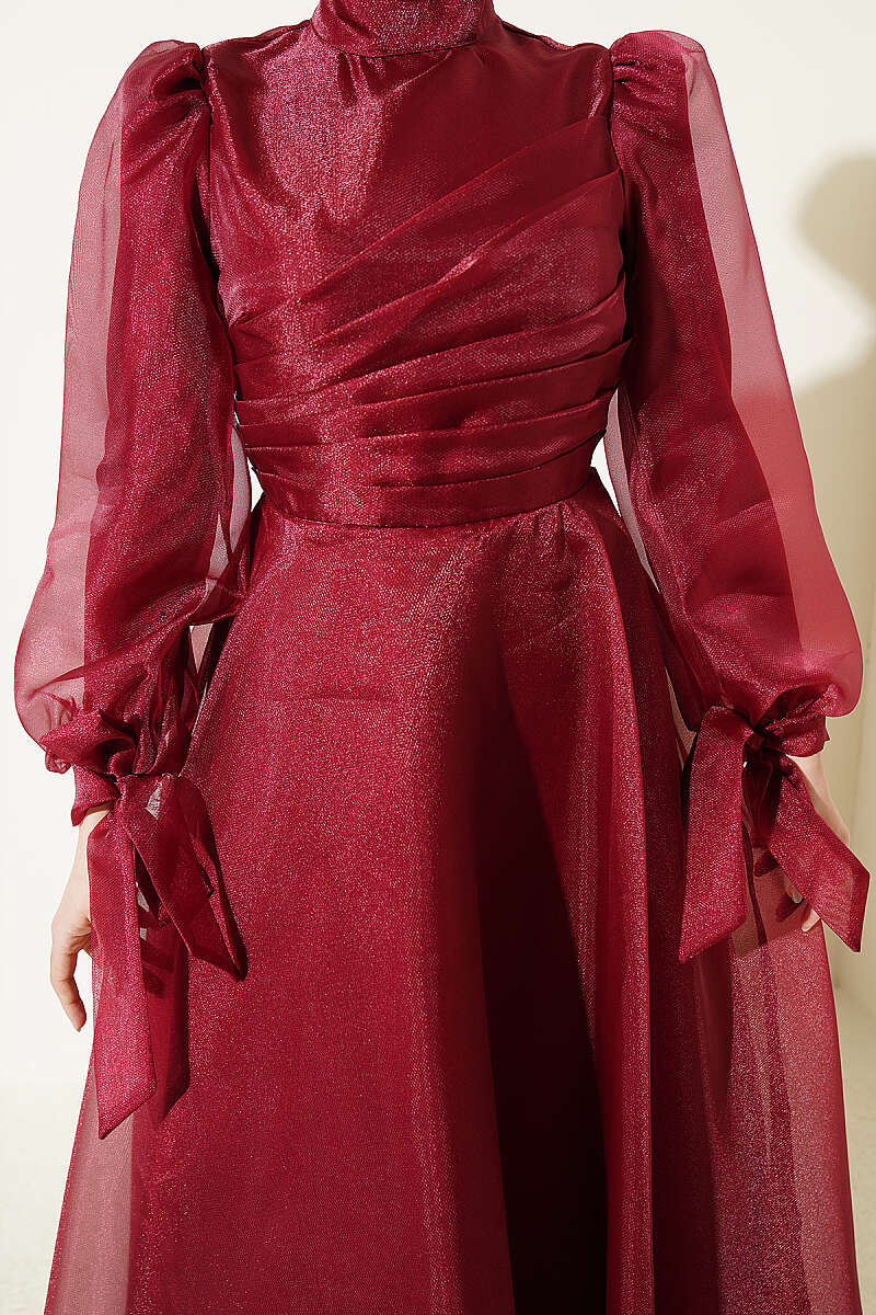 Önü Pileli Tül Abiye Elbise Bordo