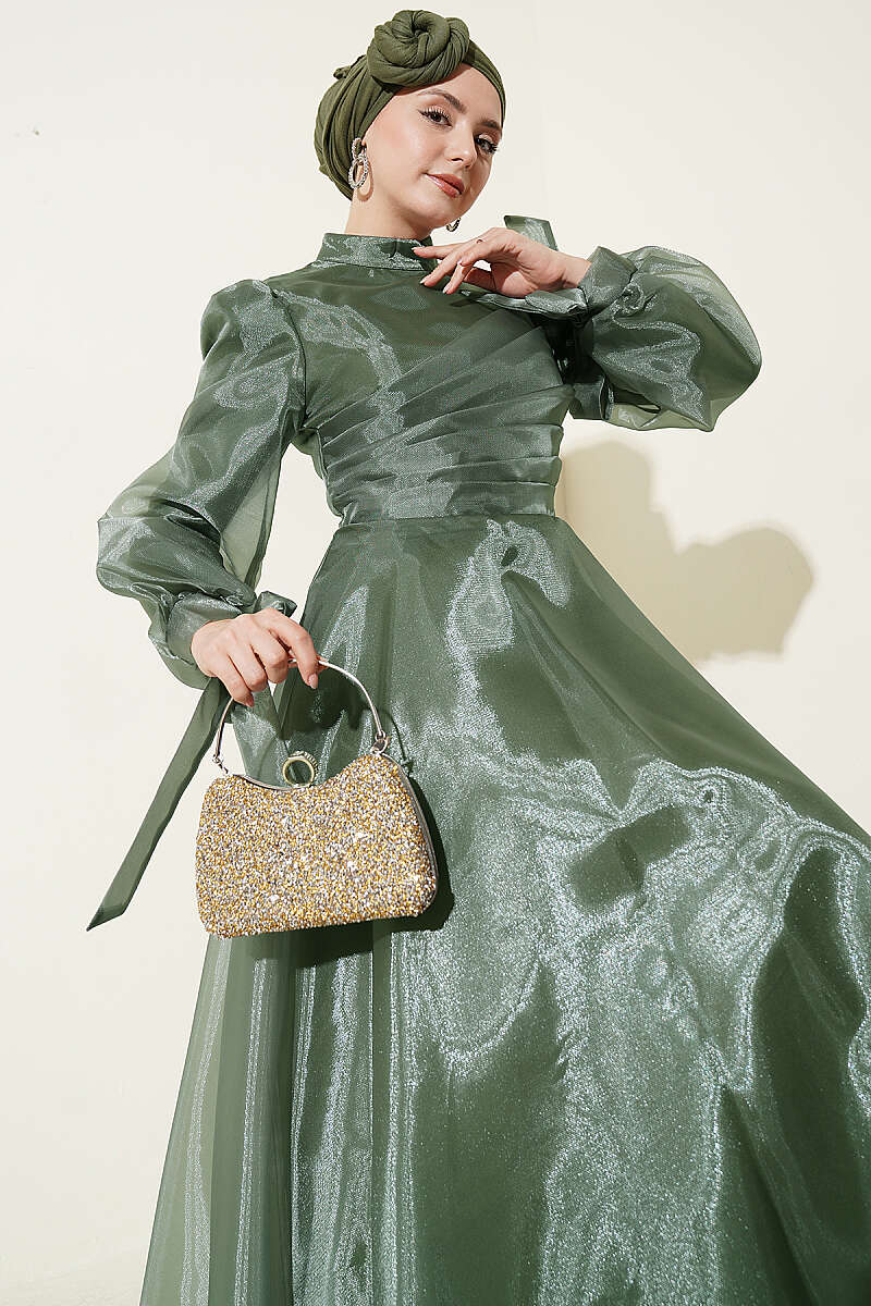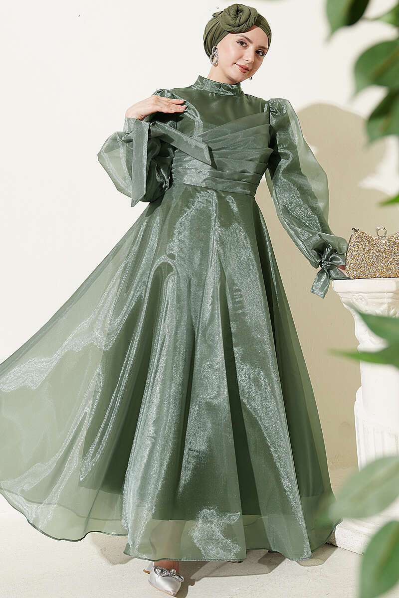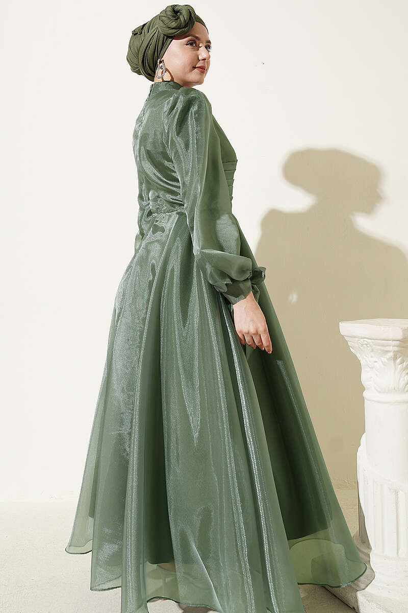 Çiçek Kabartmalı Hakim Yaka Katlı Elbise Vizon