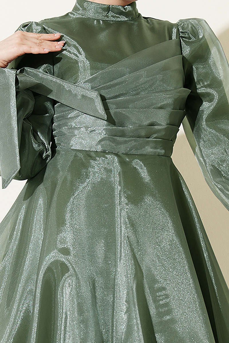 Bilek Çizgili Yarım Düğmeli Elbise Çağla Yeşili