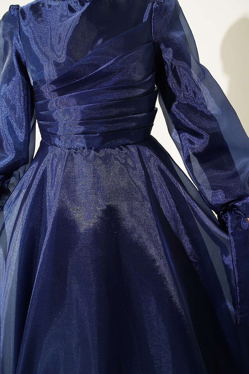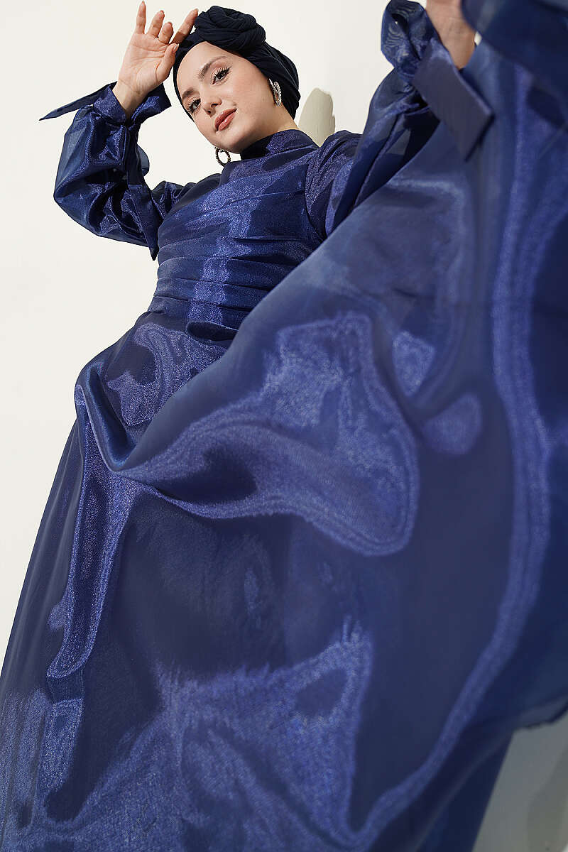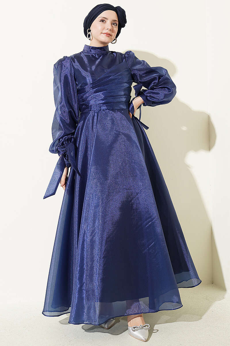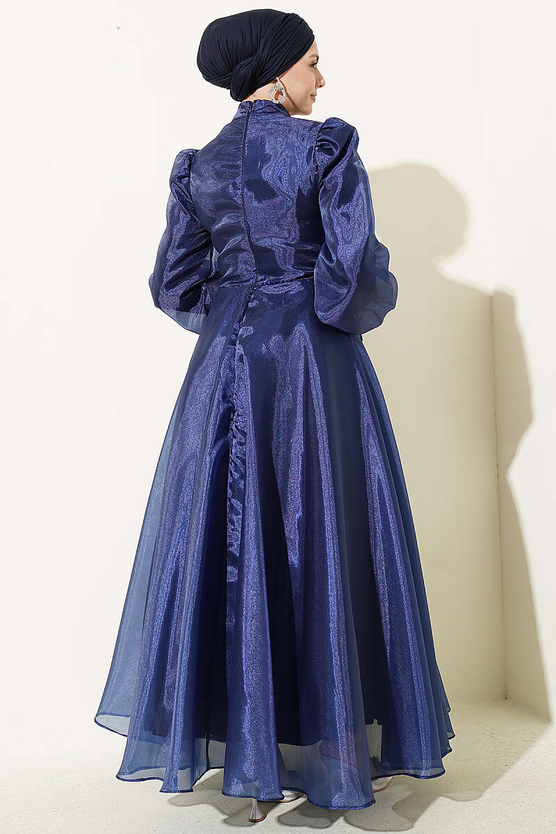 Çiçek Kabartmalı Hakim Yaka Katlı Elbise Mavi