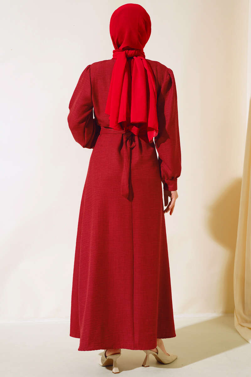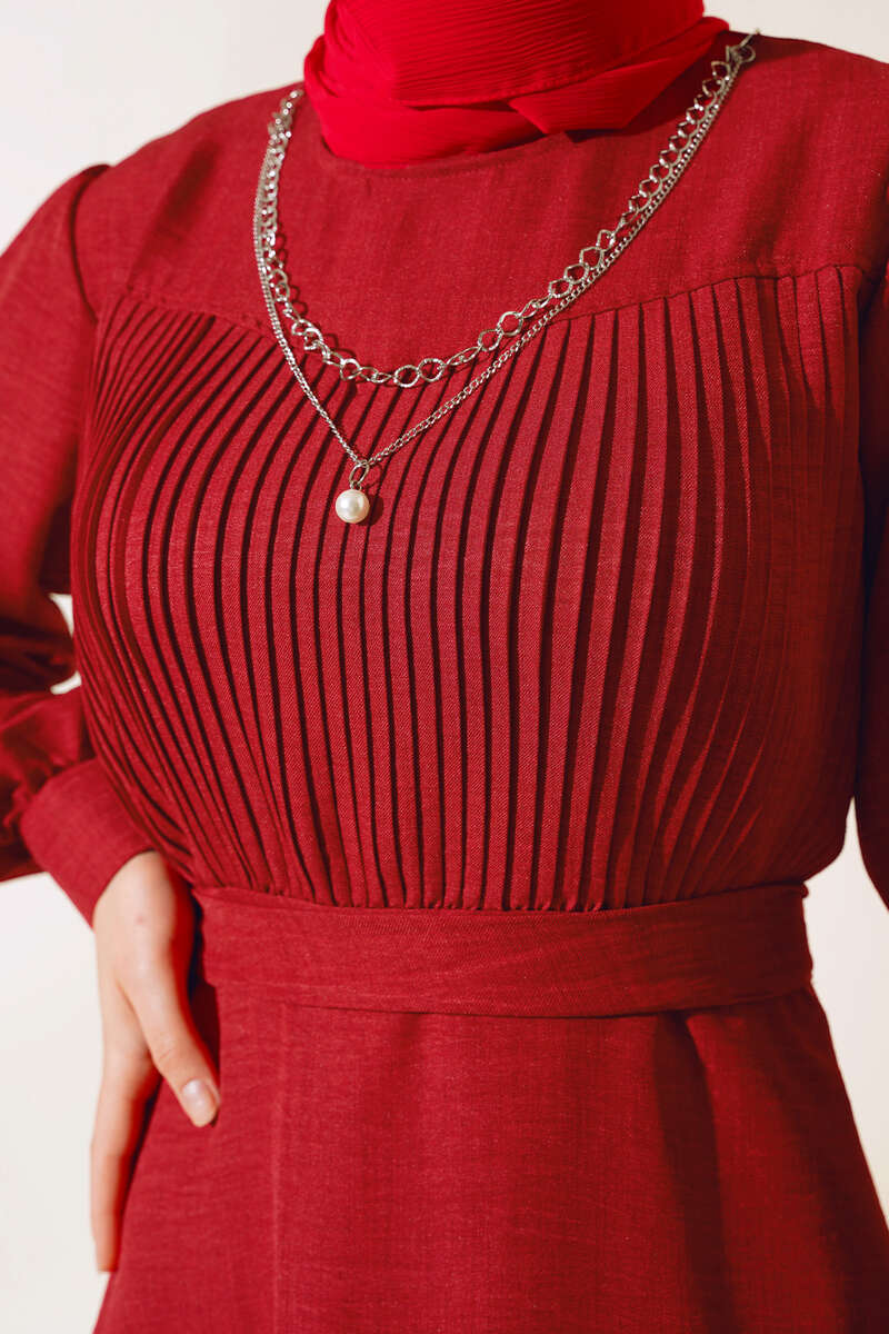 Önü Piliseli Keten Elbise Bordo