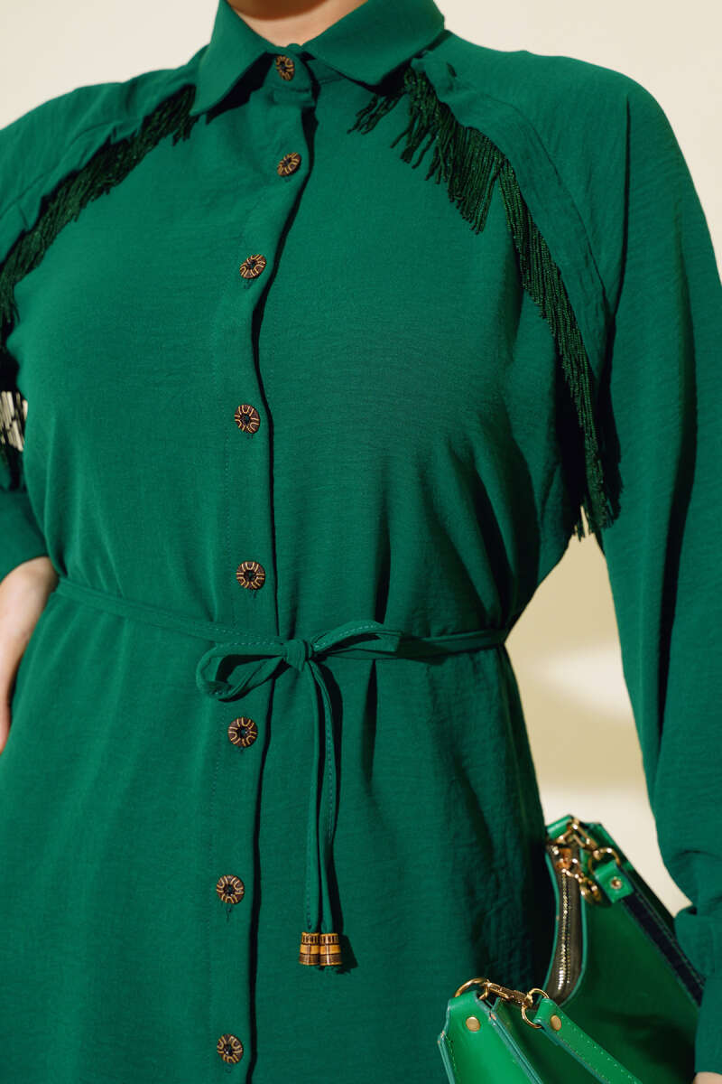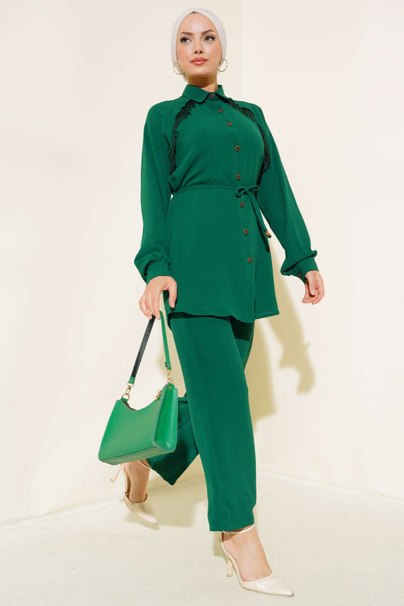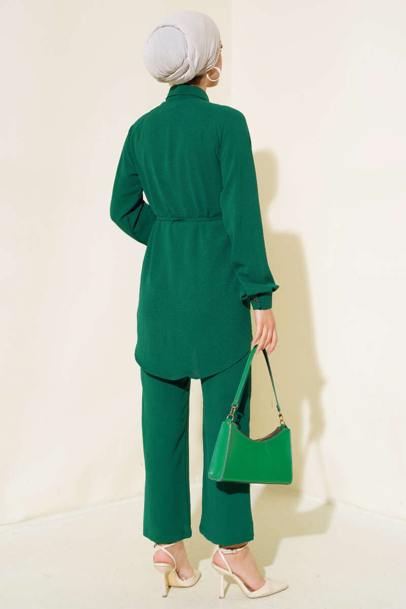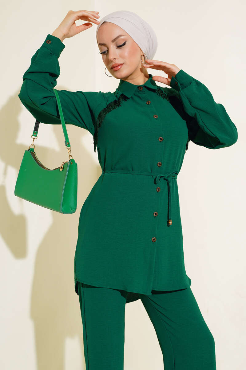 Yeni sezon ikili takımımız favorileriniz arasında girecektir. Tuniğimizin önü boydan düğmelidir. Kol bilekleri manşetli ve düğmelidir. Önü püskül detaylıdır. Belinde iki adet kemer köprüsü olup bir adet ip bağcığı vardır. Pantolonumuzun beli lastiklidir. Geniş paçalıdır. Cepsiz modeldir. İkili takımımız renk seçenekleri ile beraber dolabınızdaki yerini beklemektedir.