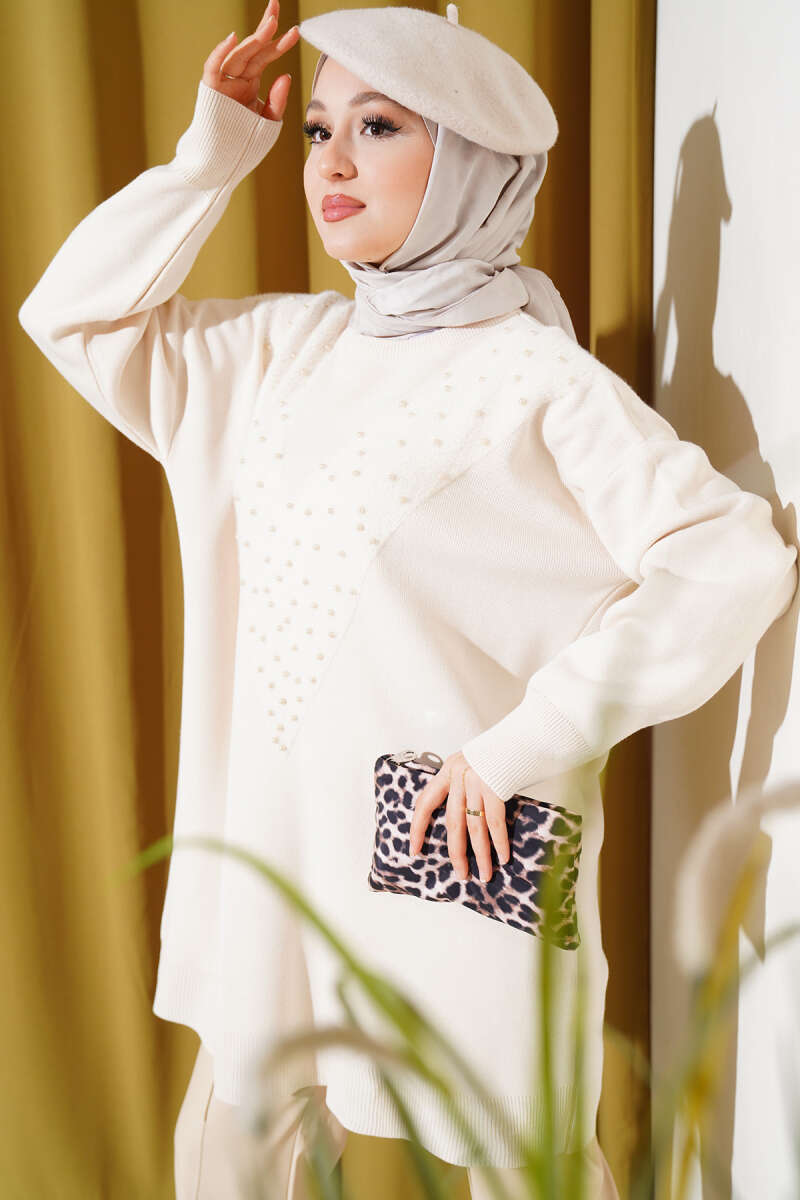 Asimetrik Kabartma Çizgili Triko Tunik Ekru
