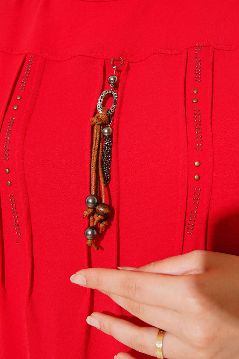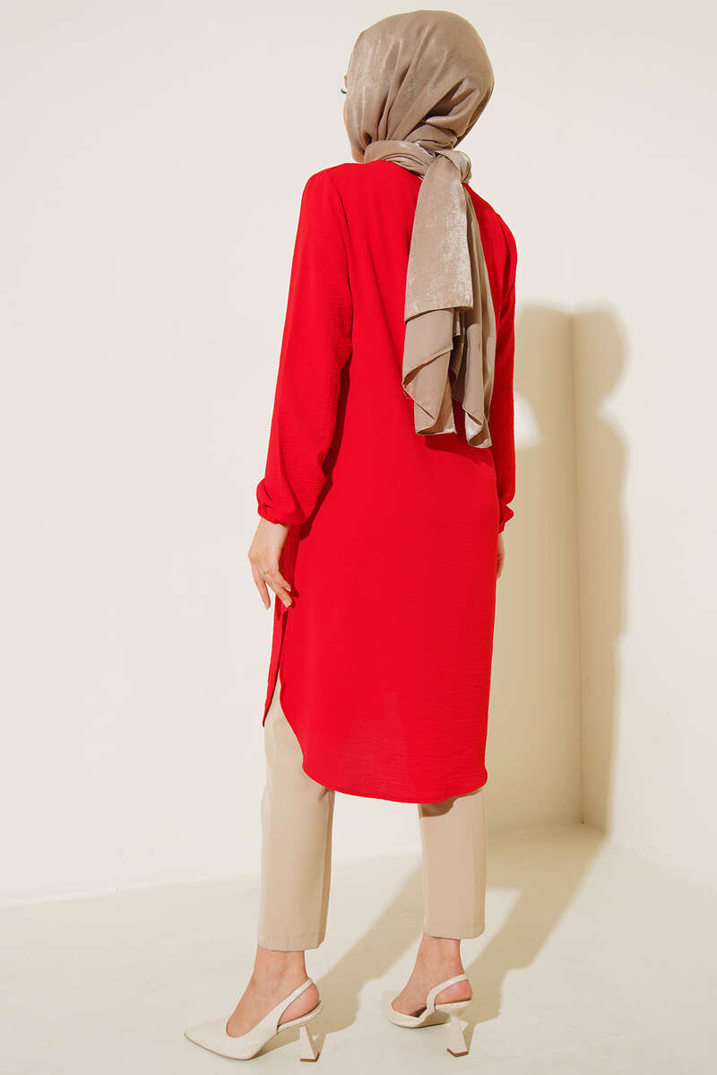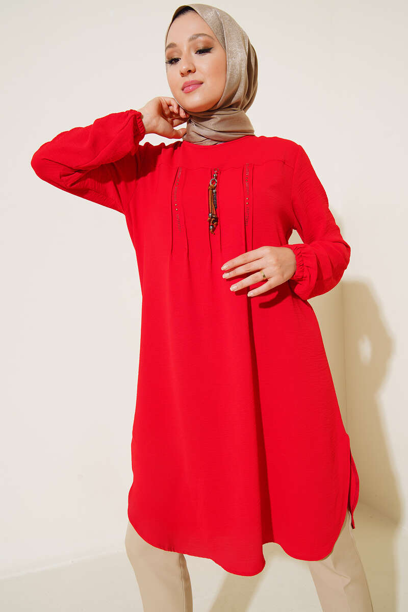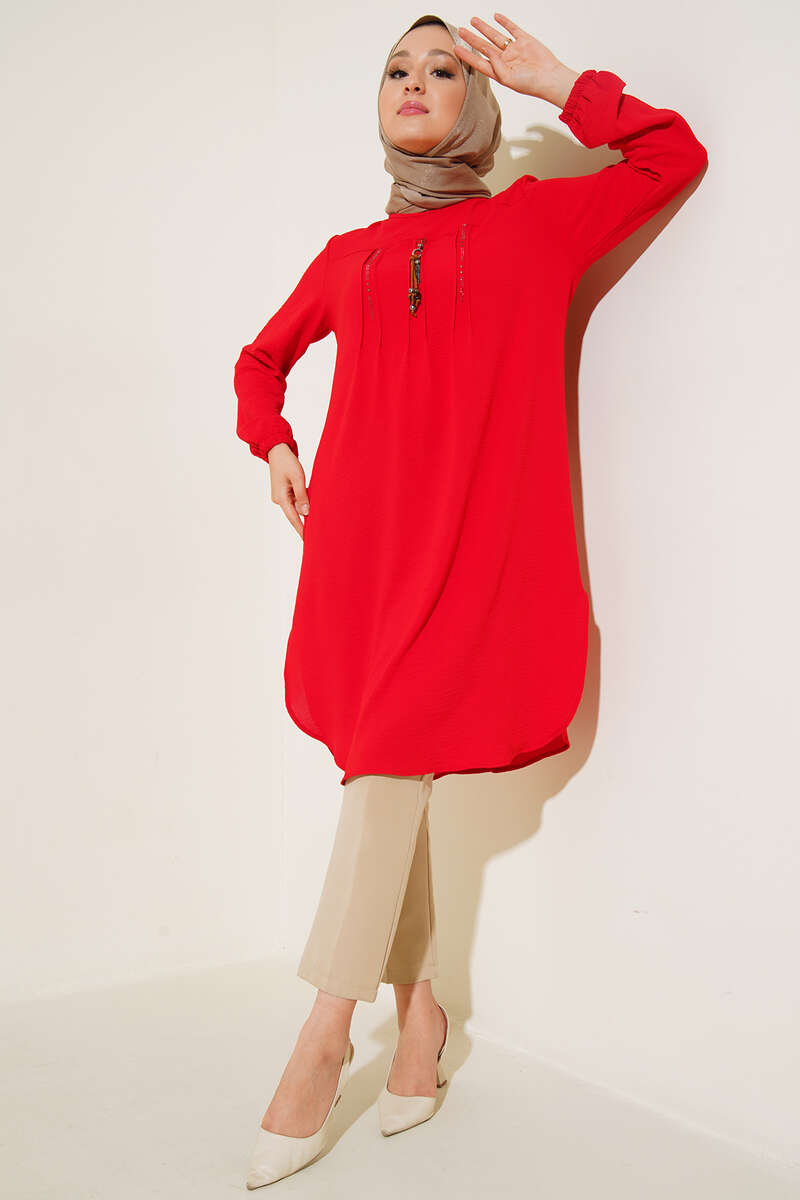 Önü Takı Detaylı Uzun Tunik Kırmızı
