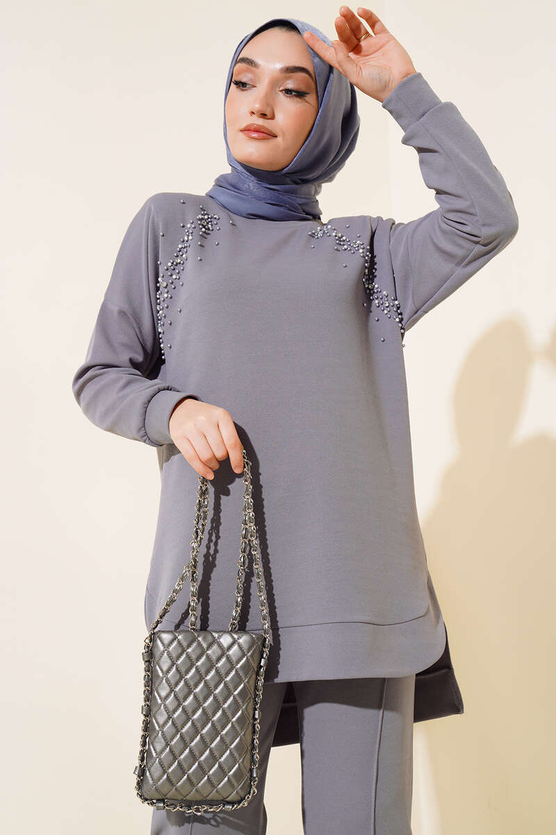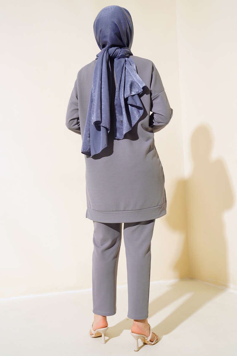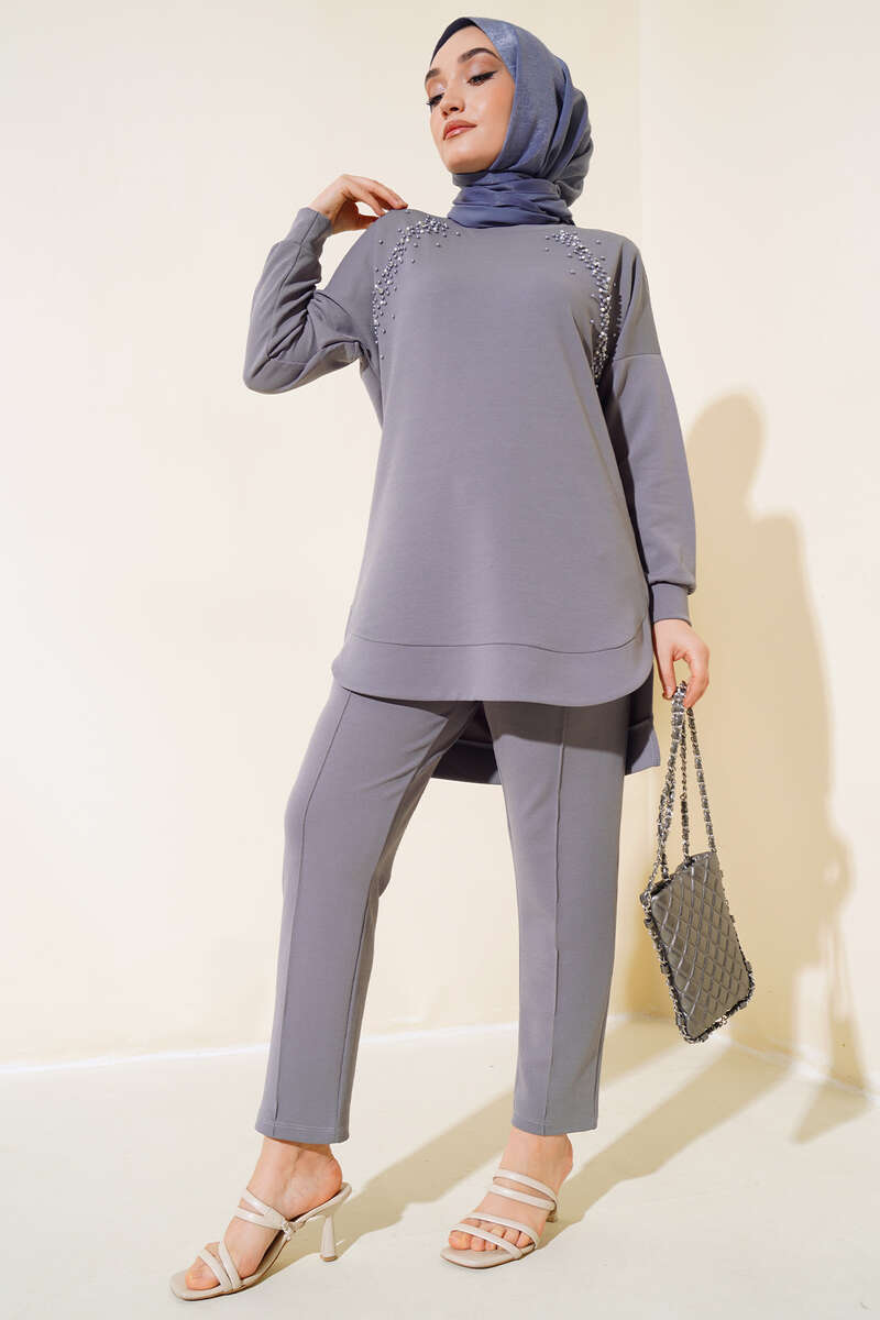 Yeni sezon ikili takım modelimiz sizlerle beraber. Tuniğimizin önü taş detaylıdır. Oval yakadır. Tuniğimizin önü kısa arkası uzun modeldir. Tuniğimiz düşük omuzdur. Pantolonumuzun beli lastiklidir. Önü çımalıdır. Cepsiz modeldir. Sade ve şık olan ikili takımımızı çok seveceksiniz. Renk seçenekleri mevcuttur.