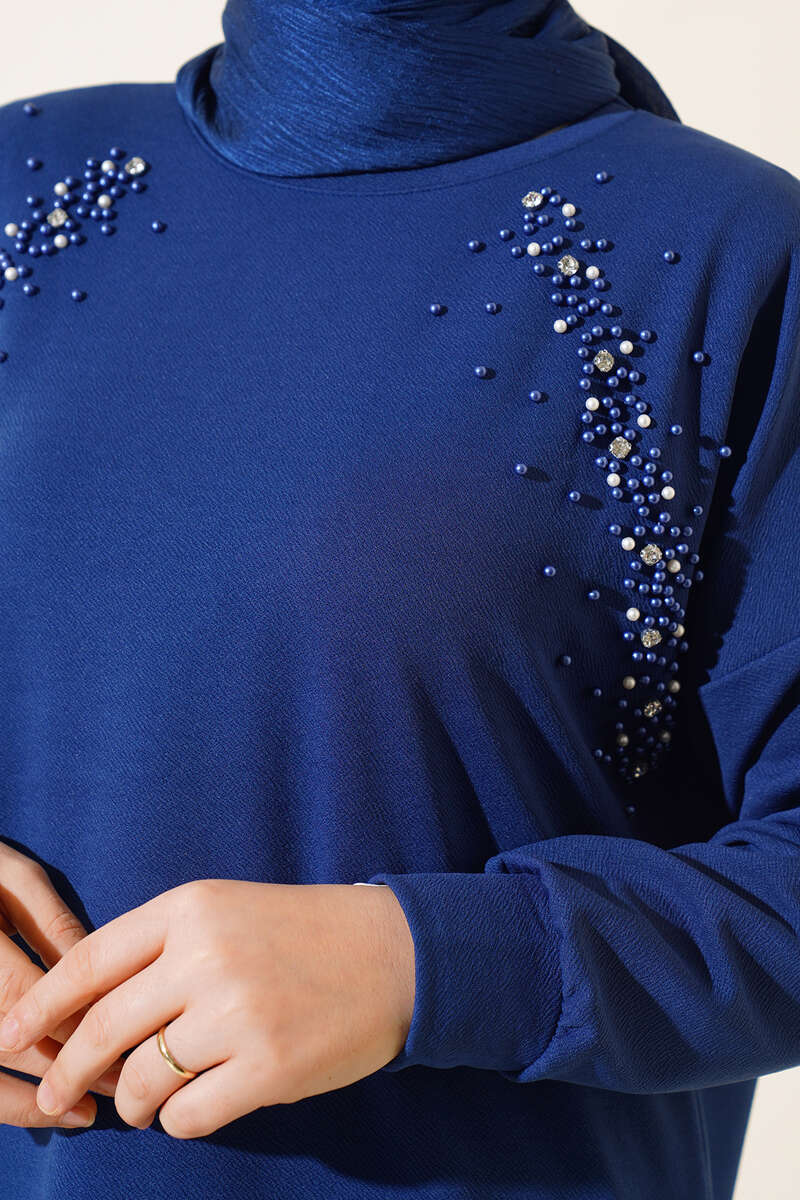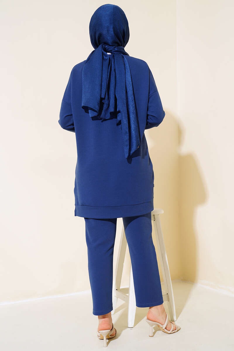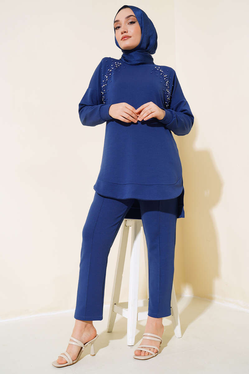 Yeni sezon ikili takım modelimiz sizlerle beraber. Tuniğimizin önü taş detaylıdır. Oval yakadır. Tuniğimizin önü kısa arkası uzun modeldir. Tuniğimiz düşük omuzdur. Pantolonumuzun beli lastiklidir. Önü çımalıdır. Cepsiz modeldir. Sade ve şık olan ikili takımımızı çok seveceksiniz. Renk seçenekleri mevcuttur.