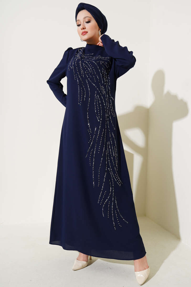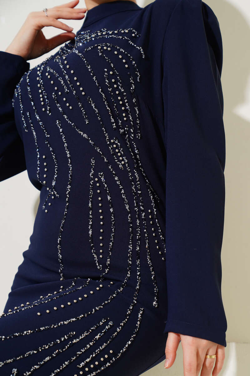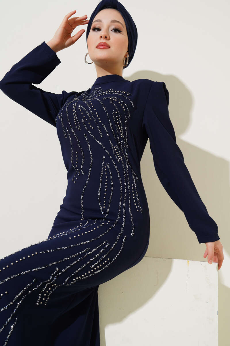 Pelerin Detaylı Pul Payet Abiye Elbise Lacivert
