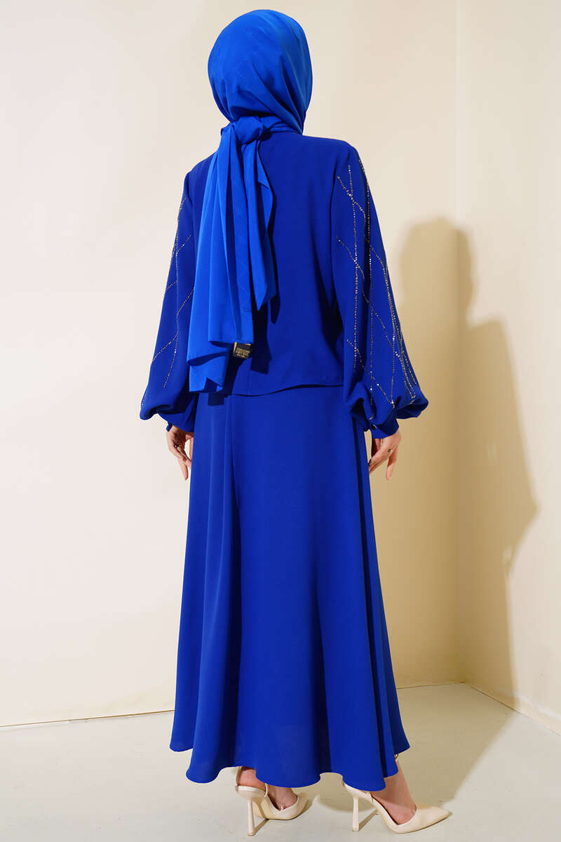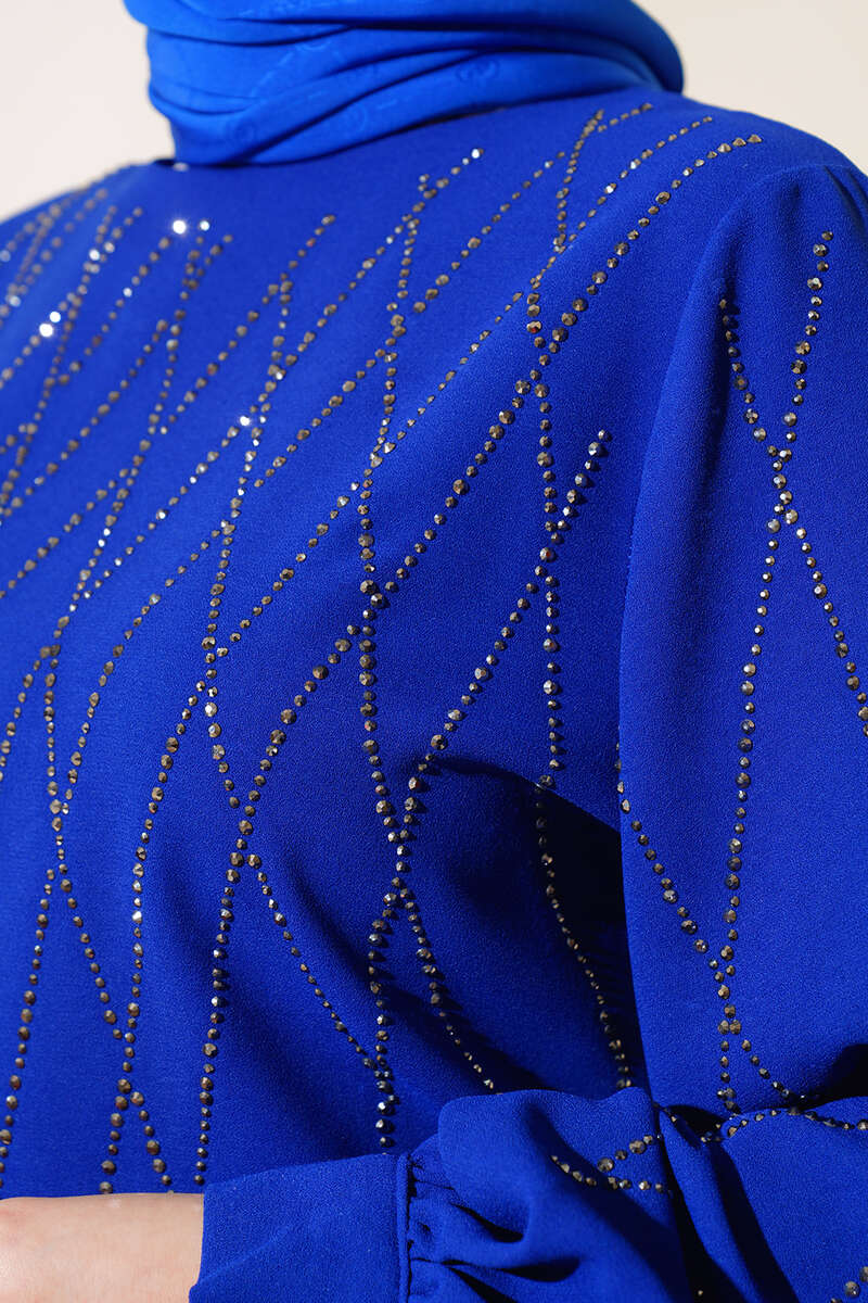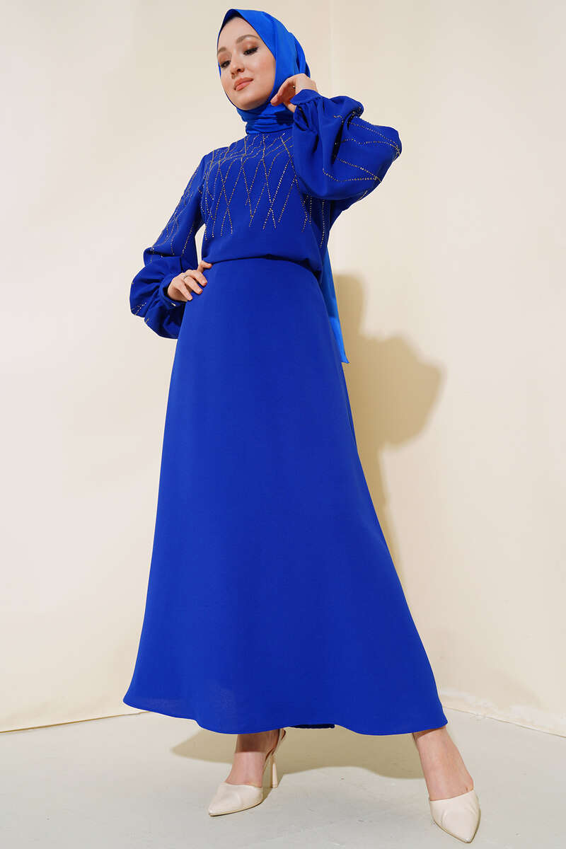 Yeni sezon ikili etekli takım modelimiz sizlerle beraber. Tuniğimizin önü ve kolları taşlarla süslüdür. Kolları geniş olan tuniğimizin sırt fermuarı bulunmaktadır. Kol bilekleri manşetli düğmelidir. Eteğimiz kloş modeldir, fermuarlıdır.