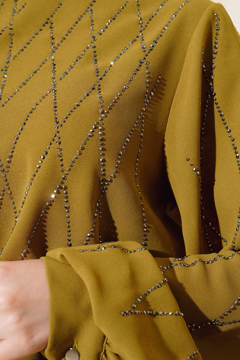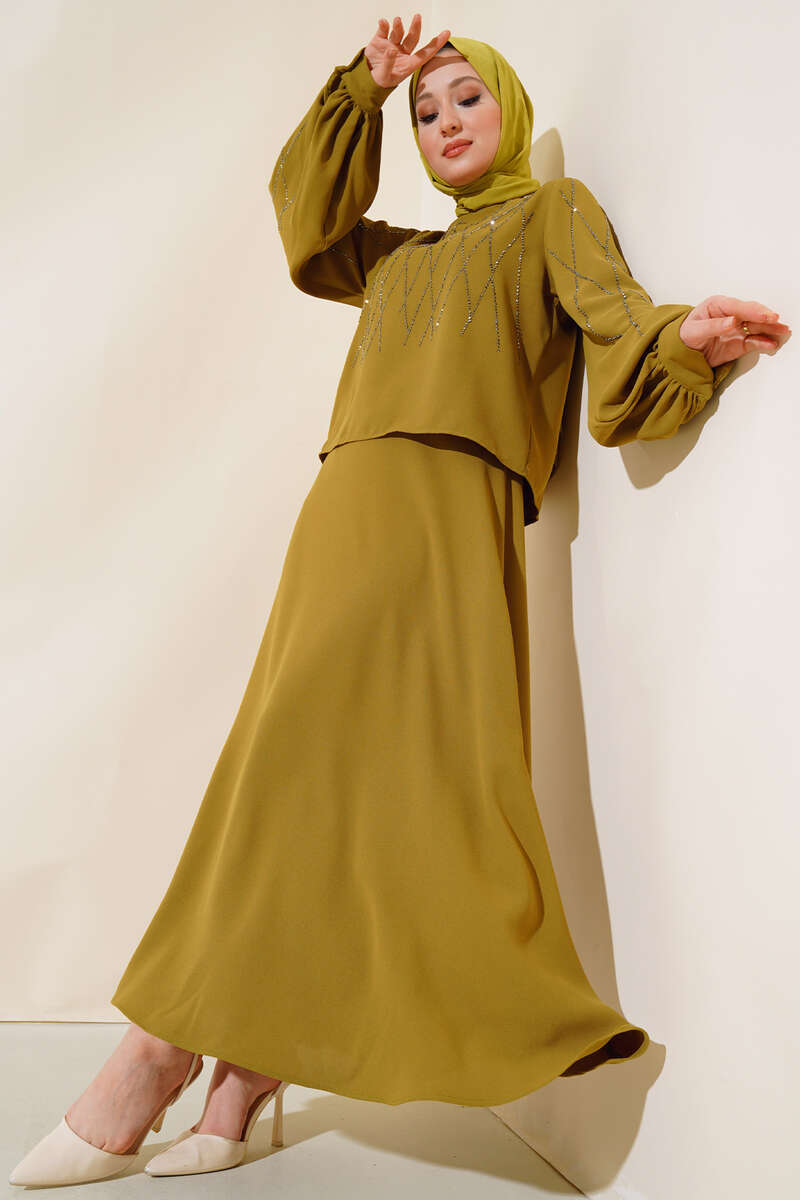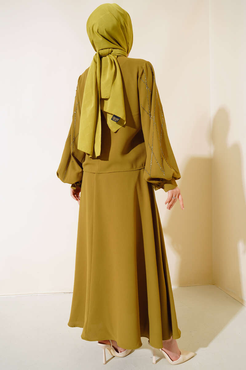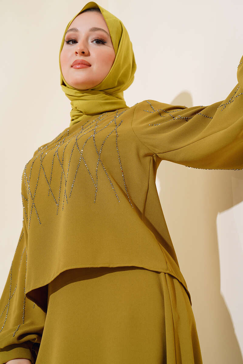 Yeni sezon ikili etekli takım modelimiz sizlerle beraber. Tuniğimizin önü ve kolları taşlarla süslüdür. Kolları geniş olan tuniğimizin sırt fermuarı bulunmaktadır. Kol bilekleri manşetli düğmelidir. Eteğimiz kloş modeldir, fermuarlıdır.