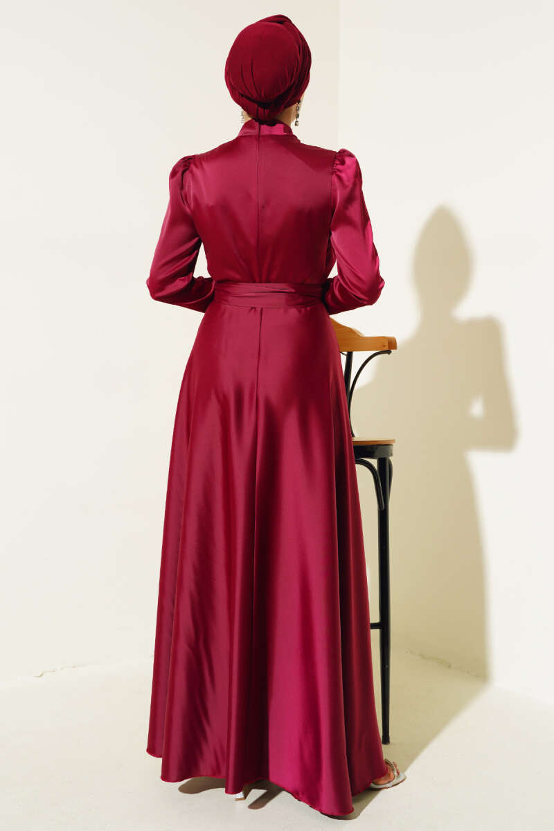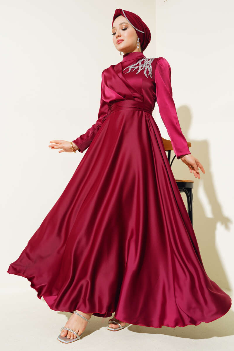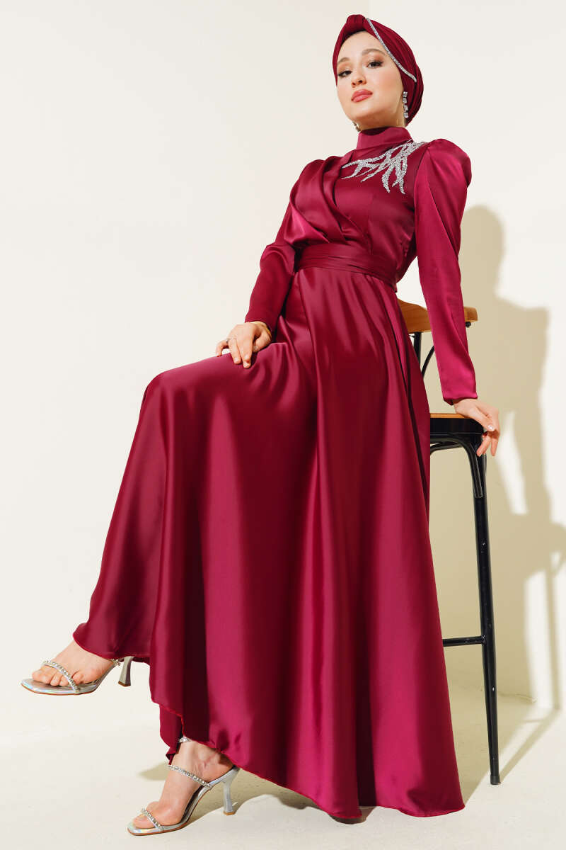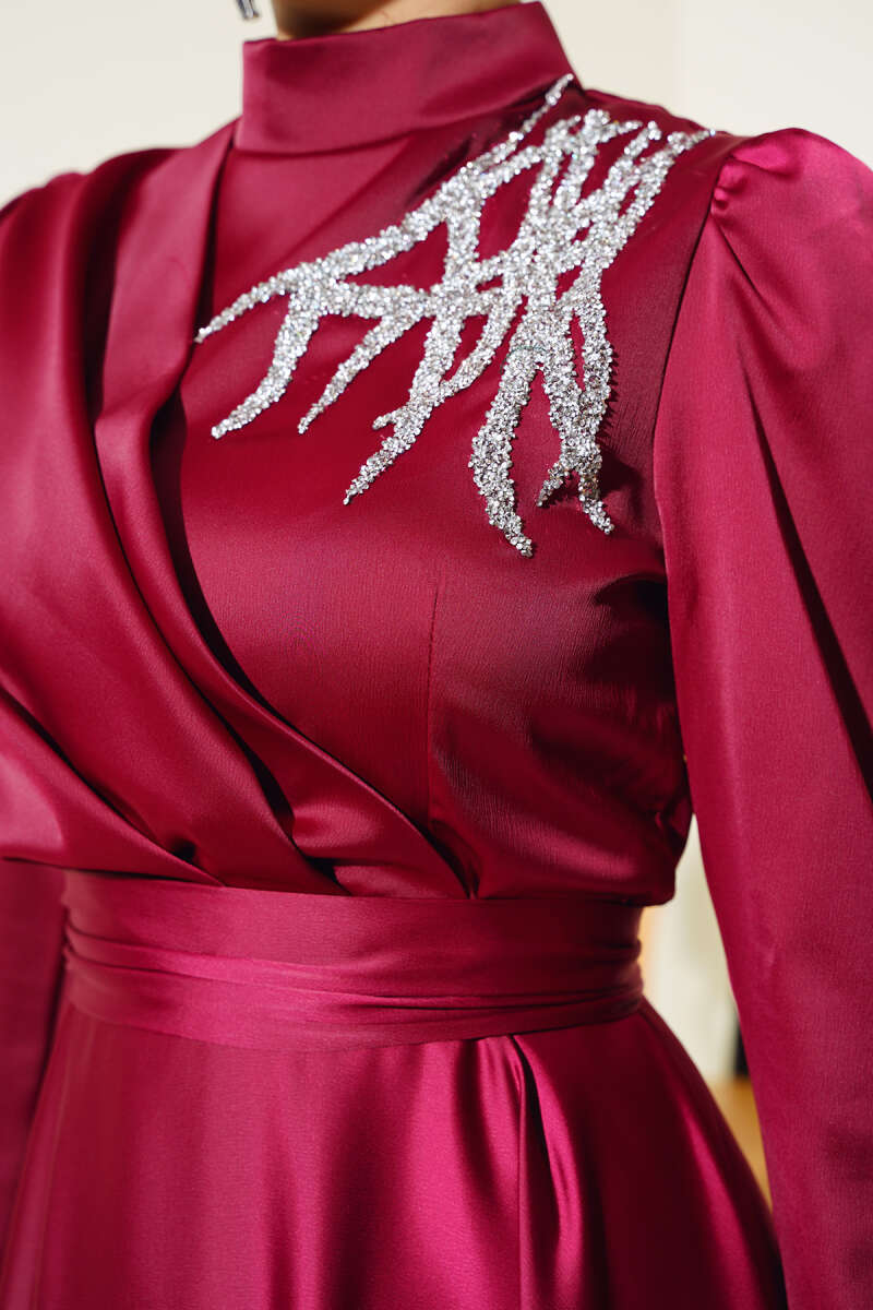 Omuz Pelerinli Taş Detaylı Abiye Elbise Bordo