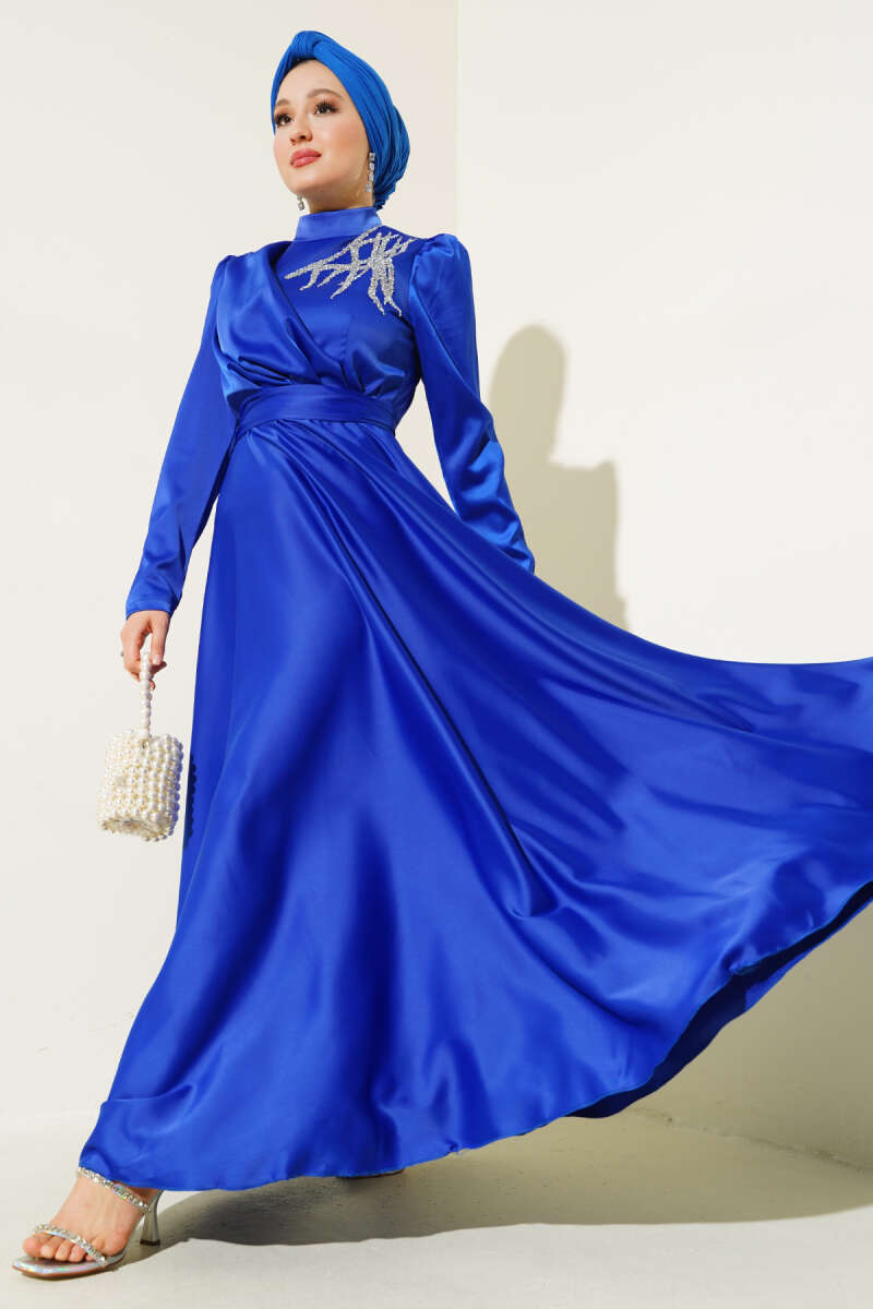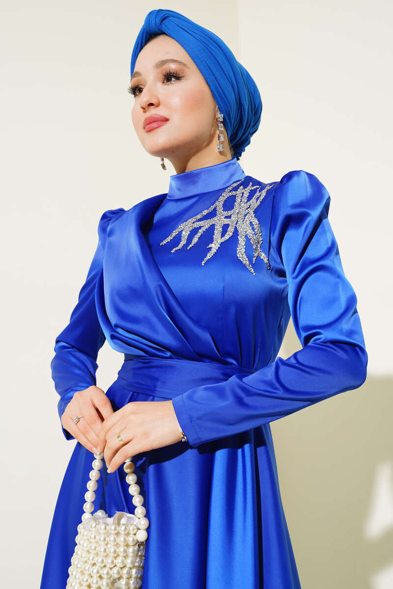 Omuz Pelerinli Taş Detaylı Abiye Elbise Lacivert