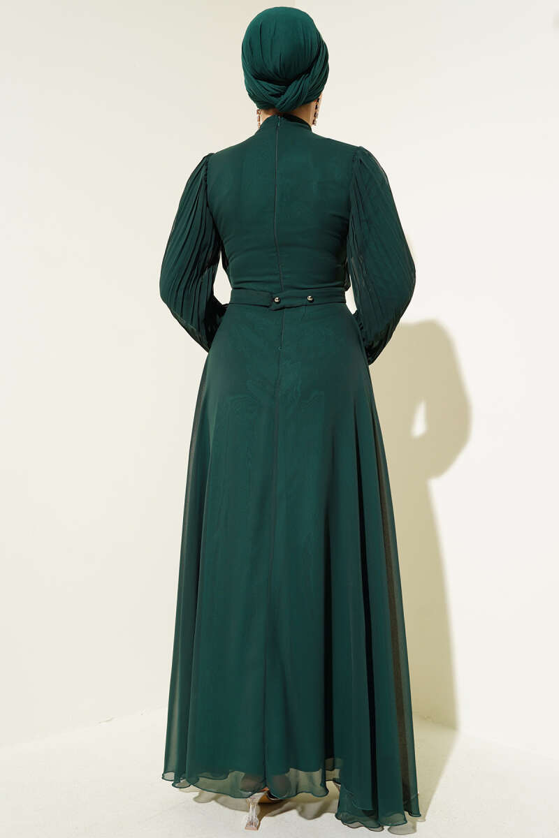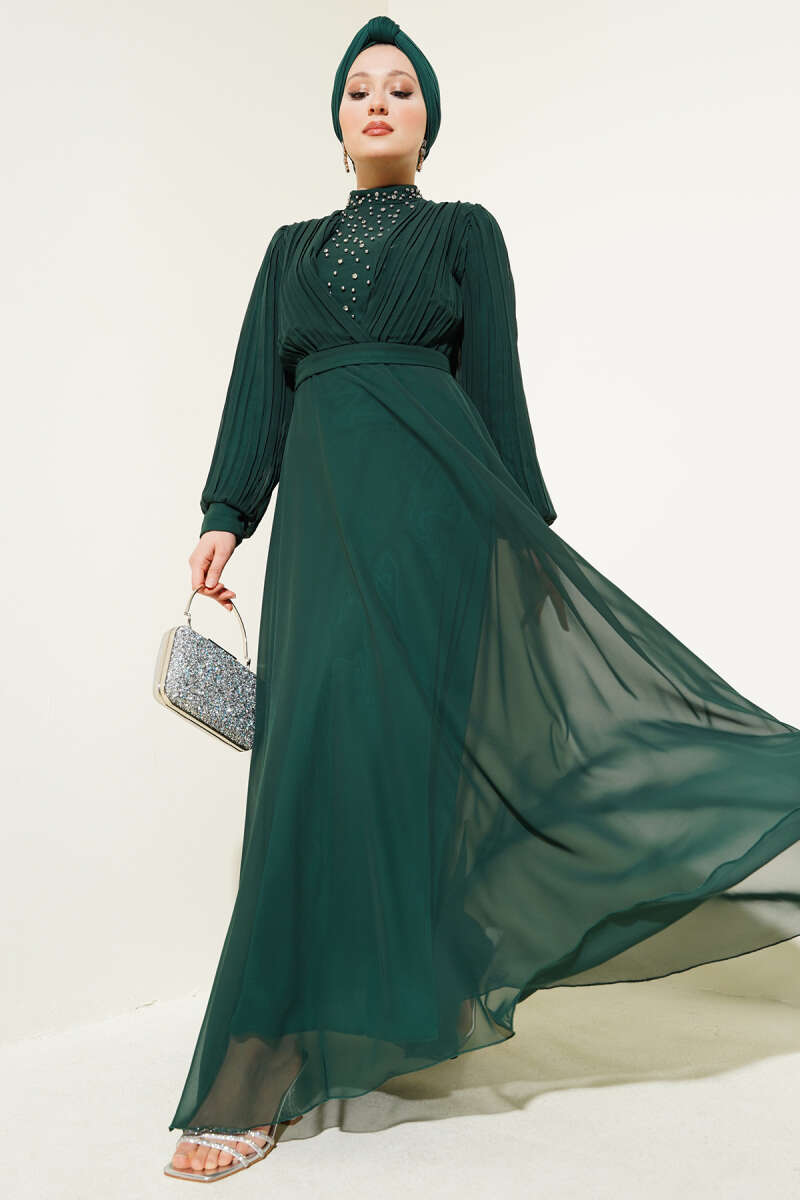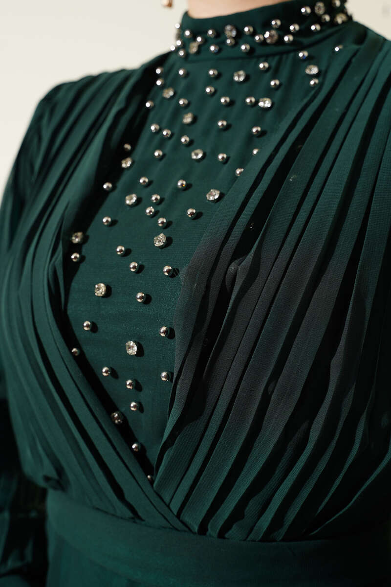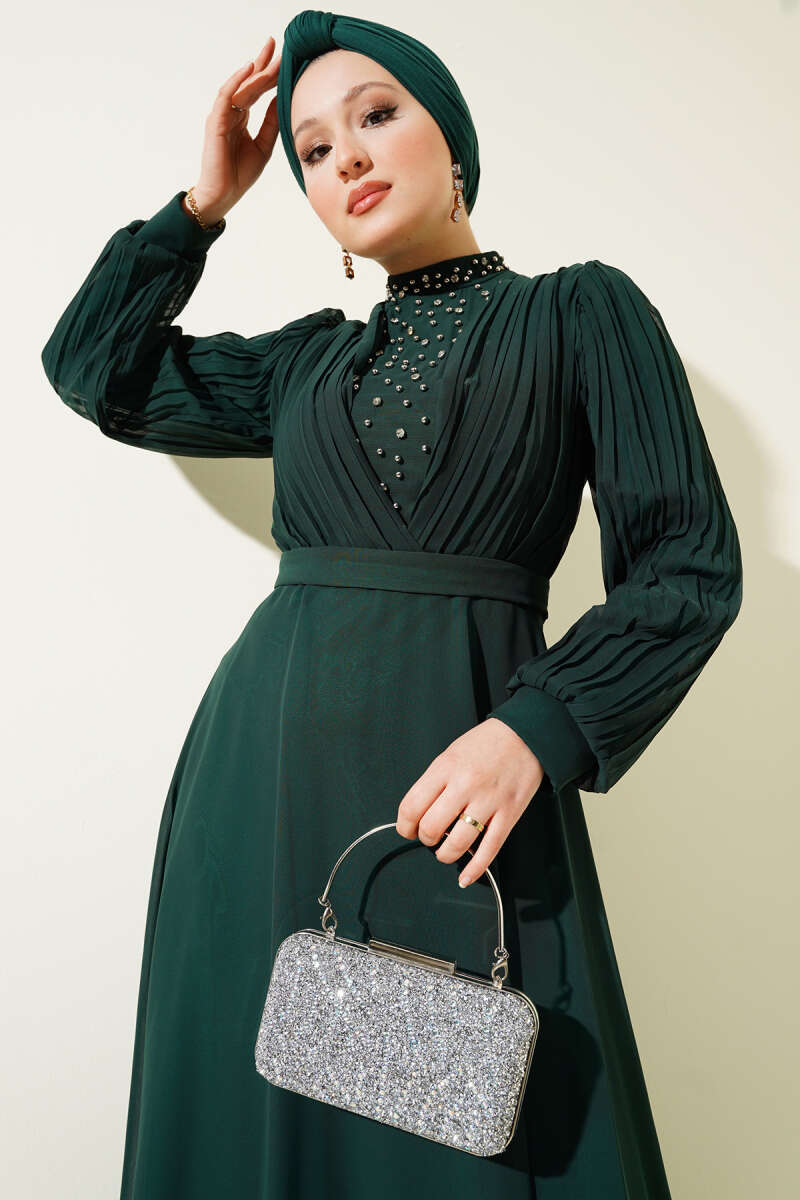 Önü Taşlı Pileli Şifon Elbise Zümrüt